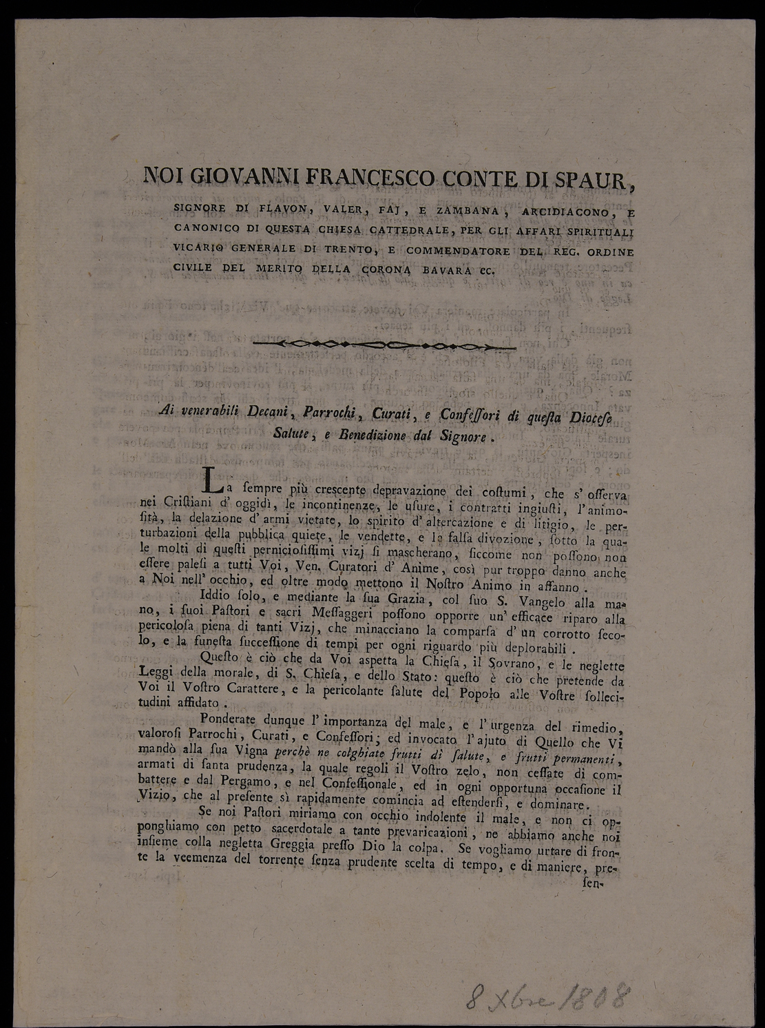 | Noi Giovanni Francesco conte di Spaur, signore di Flavon, Valer, Faj, e Zambana, arcidiacono, e canonico di questa chiesa cattedrale, per gli affari spirituali vicario generale di Trento, e commendatore del reg. ordine civile del Merito della Corona bavara ec. ... |