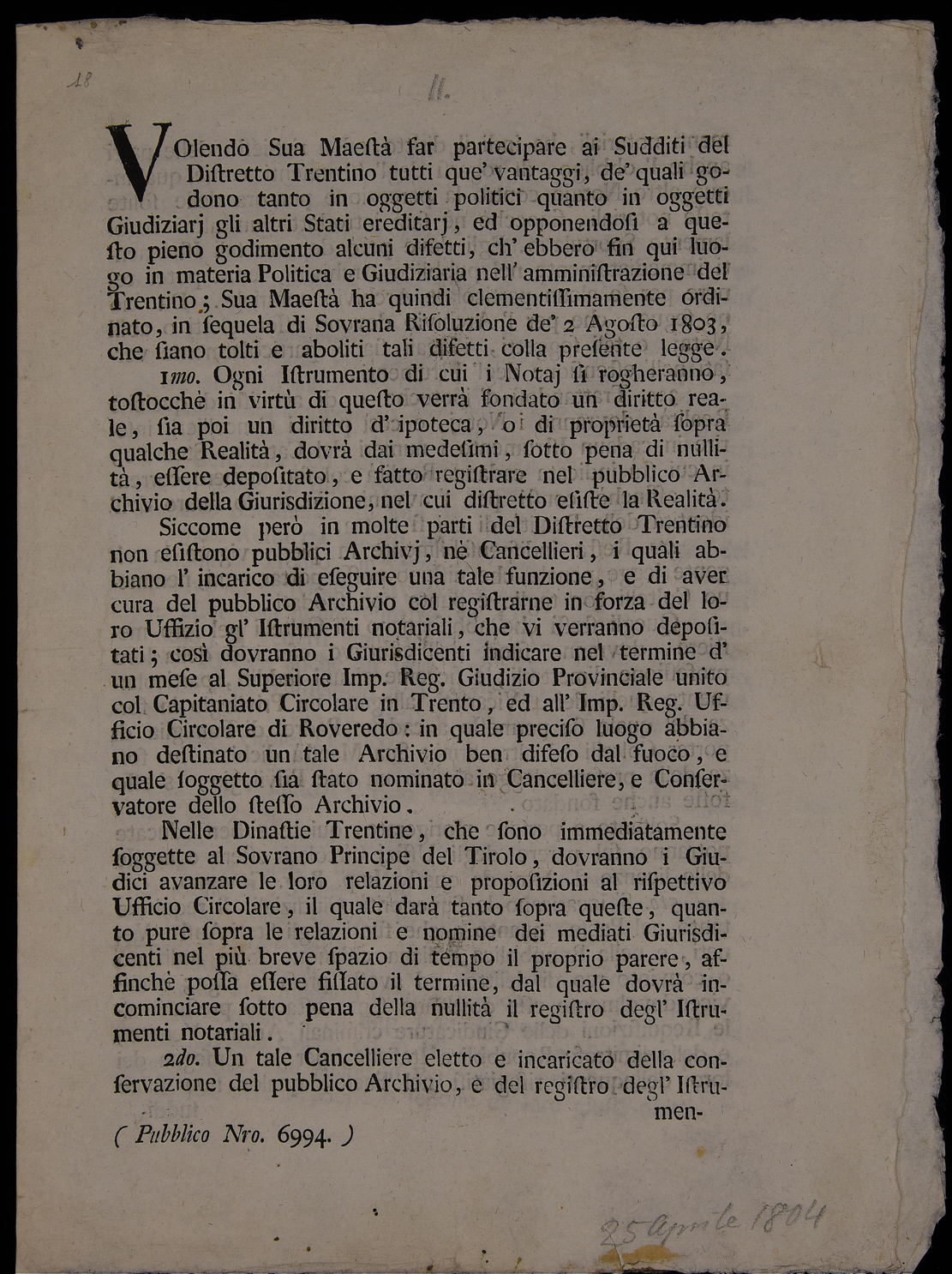 | Volendo sua maestà far partecipare ai sudditi del distretto trentino tutti que' vantaggi, de' quali godono tanto in oggetti politici quanto in oggetti giudiziarj gli altri Stati ereditarj … |
