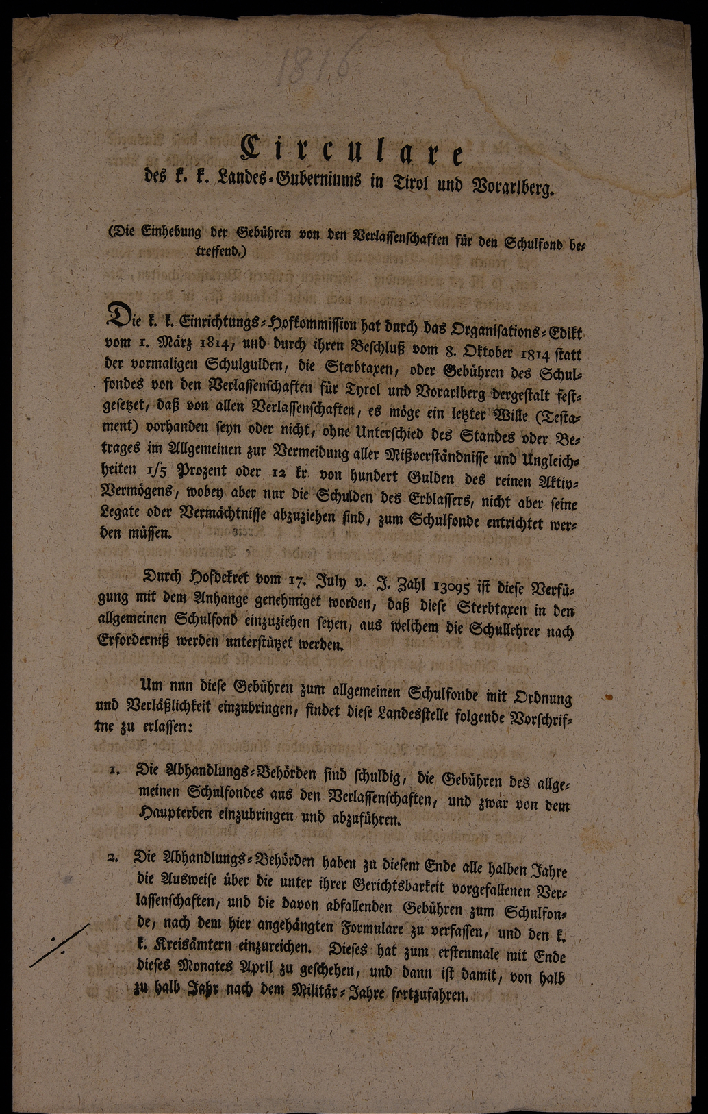 | Circulare des k.k. Landes-Guberniums in Tirol und Vorarlberg. (Die Einhebung der Gebühren von den Verlassenschaften für den Schuldfond betreffend) |