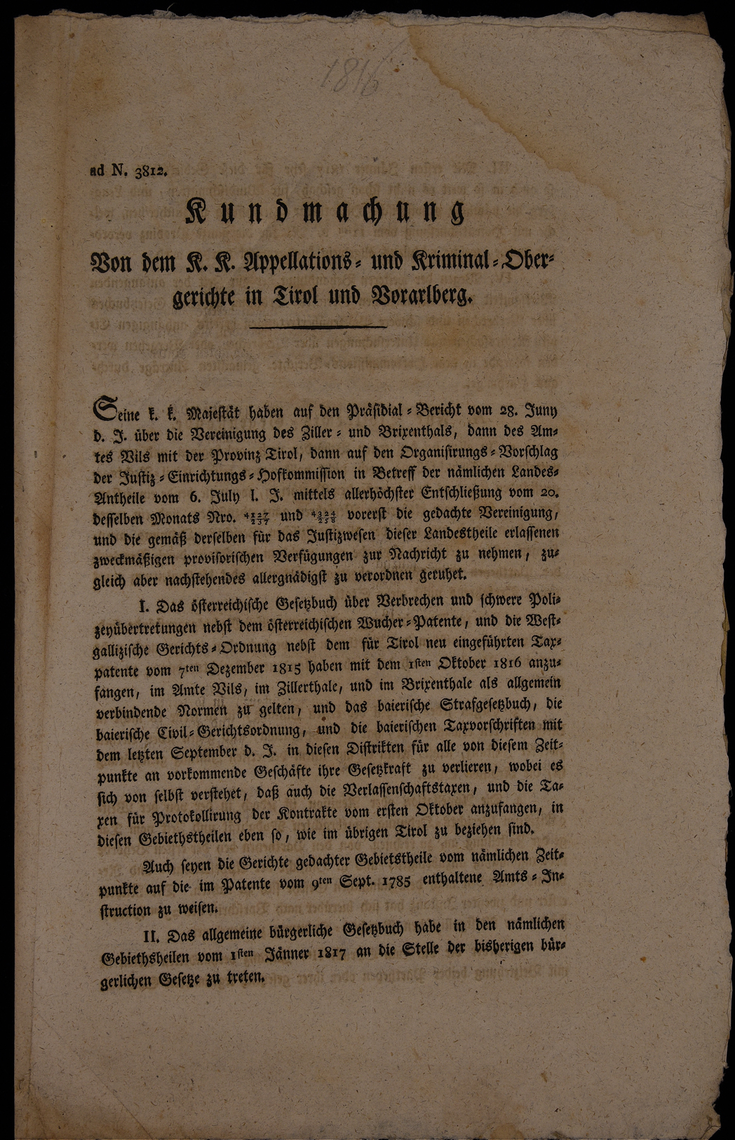 Kundmachung von dem k.k. Appellations-und Kriminal-Obergerichte in Tirol und...