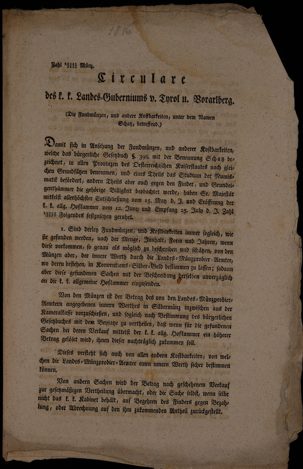 | Circulare des k.k. Landes-Guberniums v. Tyrol u. Vorarlberg. (Die Fundmünzen, und andere Kostbarkeiten, unter dem Namen Schatz, betreffend) |