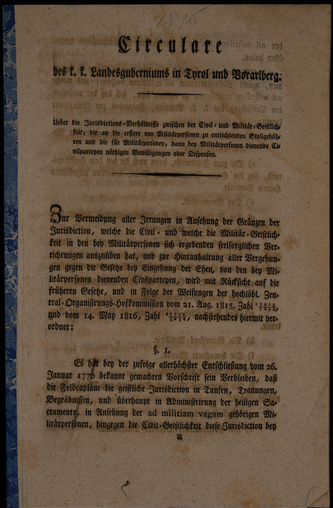 | Circulare des k.k. Landesguberniums in Tyrol und Vorarlberg. Ueber die Jurisdictions-Verhältnisse zwischen der Civil-und Militär-Geistlichkeit, die an die erstere von Militärpersonen zu entrichtenden Stollgebühren und die für Militärpersonen, dann bey Militärpersonen dienende Civilparteyen nöthigen Bewilligungen oder Dispensen |