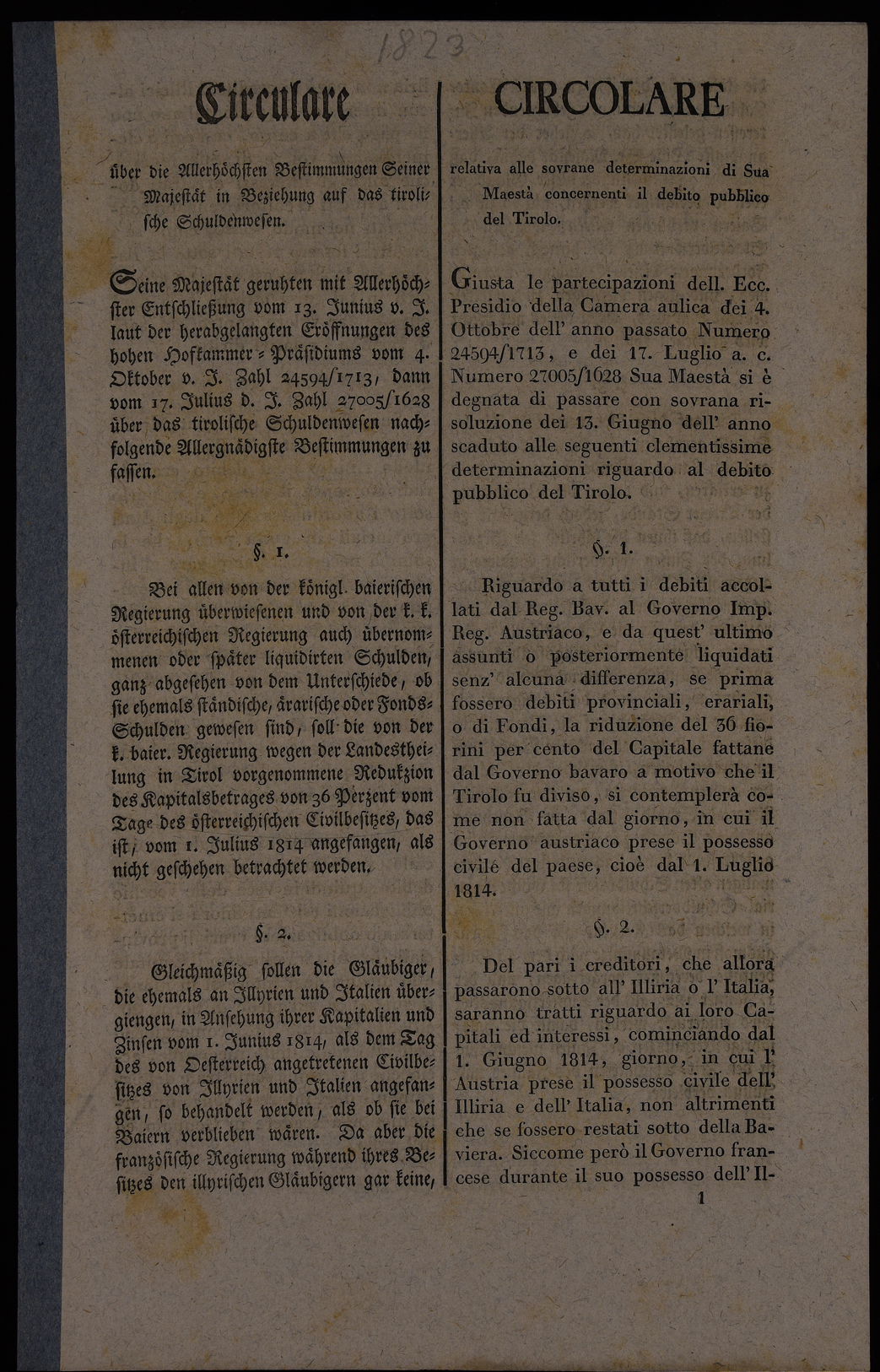 | Circolare relativa alle sovrane determinazioni di sua maestà concernenti il debito pubblico del Tirolo |