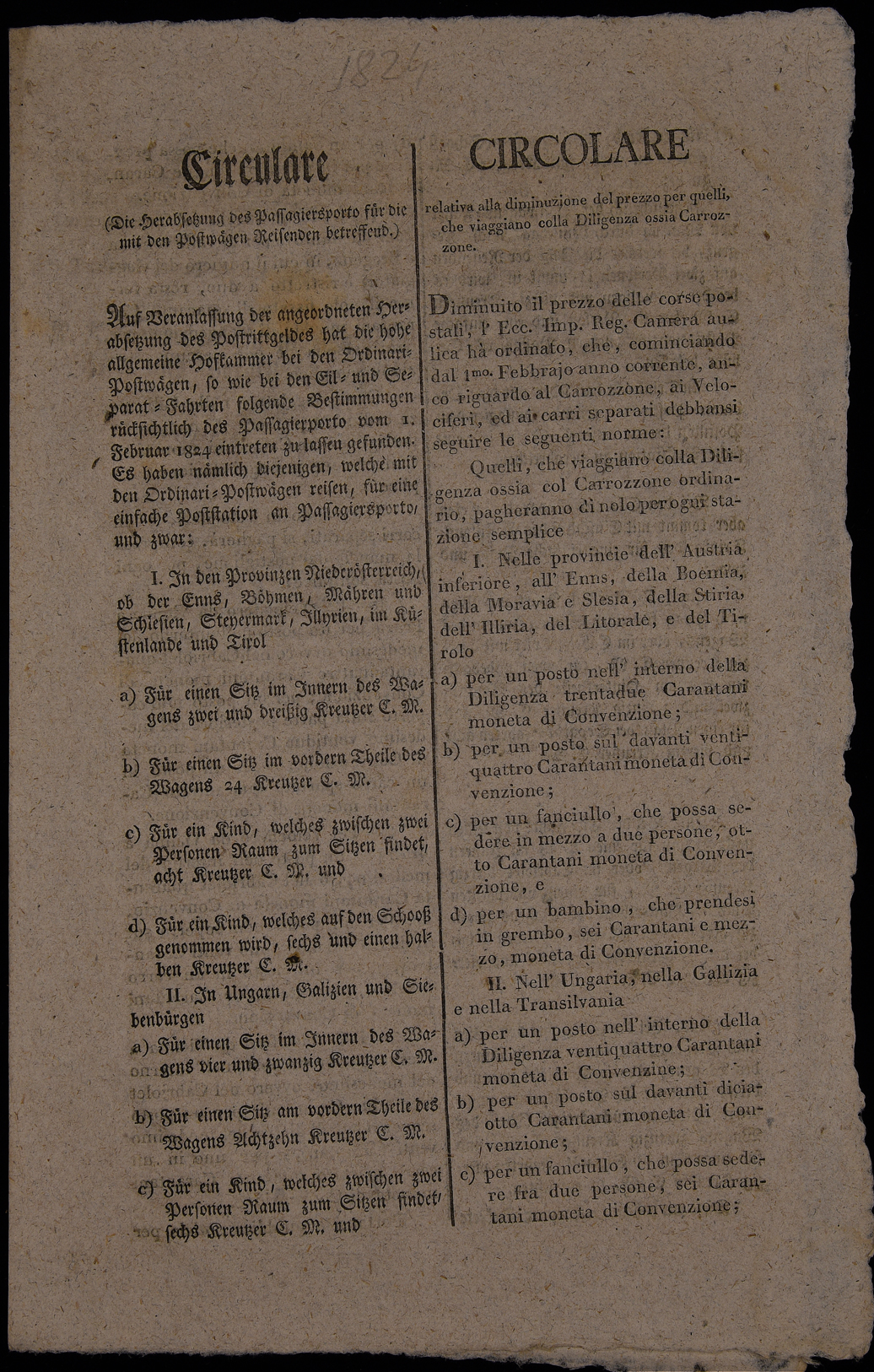 | Circulare (die Herabsetzung des Passagiersporto für die mit den Postwägen Reidsenden betreffend) |