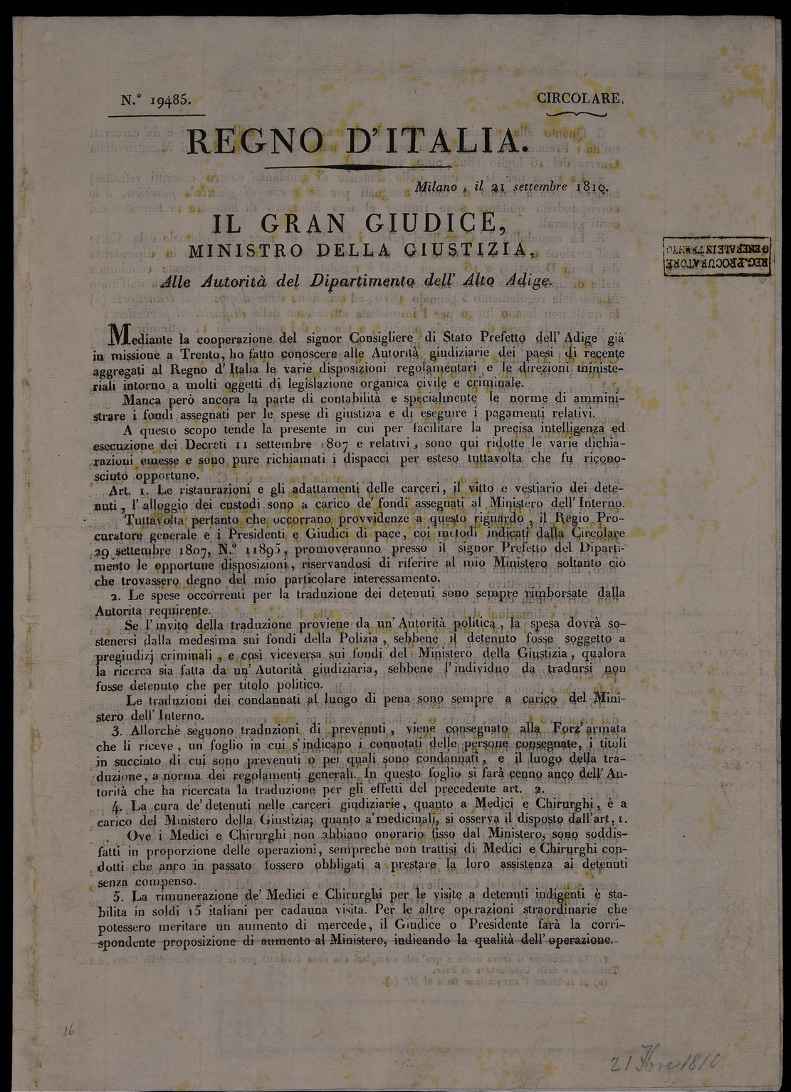 | Milano, il 21 settembre 1810. Il gran giudice, Ministro della Giustizia, alle autorità del Dipartimento dell'Alto Adige |