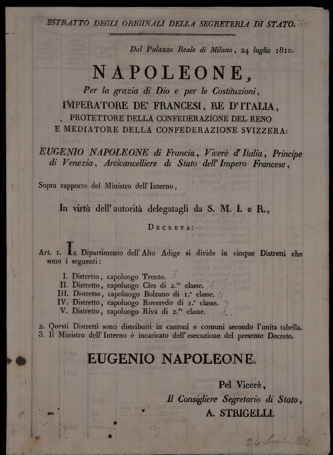 | Estratto degli originali della Segreteria di Stato. Dal palazzo reale di Milano, 24 luglio 1810. Napoleone, per la grazia di Dio e per le costituzioni, Imperatore de' francesi, re d'Italia ... |