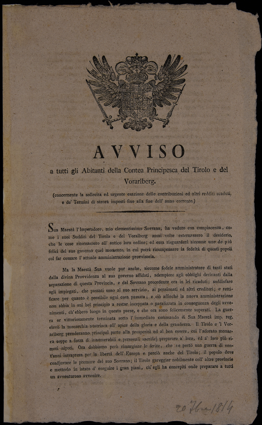 | Avviso a tutti gli abitanti della contea principesca del Tirolo e del Vorarlberg (concernente la sollecita ed urgente esazione delle contribuzioni ed altri redditi scaduti, e de' termini di steora imposti fino alla fine dell'anno corrente) |