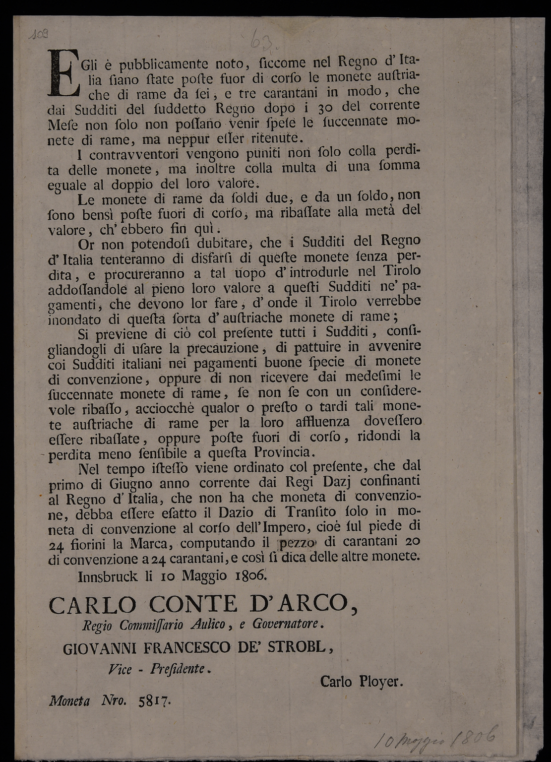 | Egli è pubblicamente noto, siccome nel Regno d'Italia siano state poste fuor di corso le monete austriache di rame da sei, e tre carantani ... |