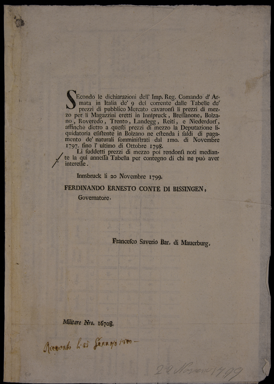 | Secondo le dichiarazioni dell'Imp. Reg. comando d'armata in Italia de' 9 del corrente delle tabelle de' prezzi di pubblico mercato ... |