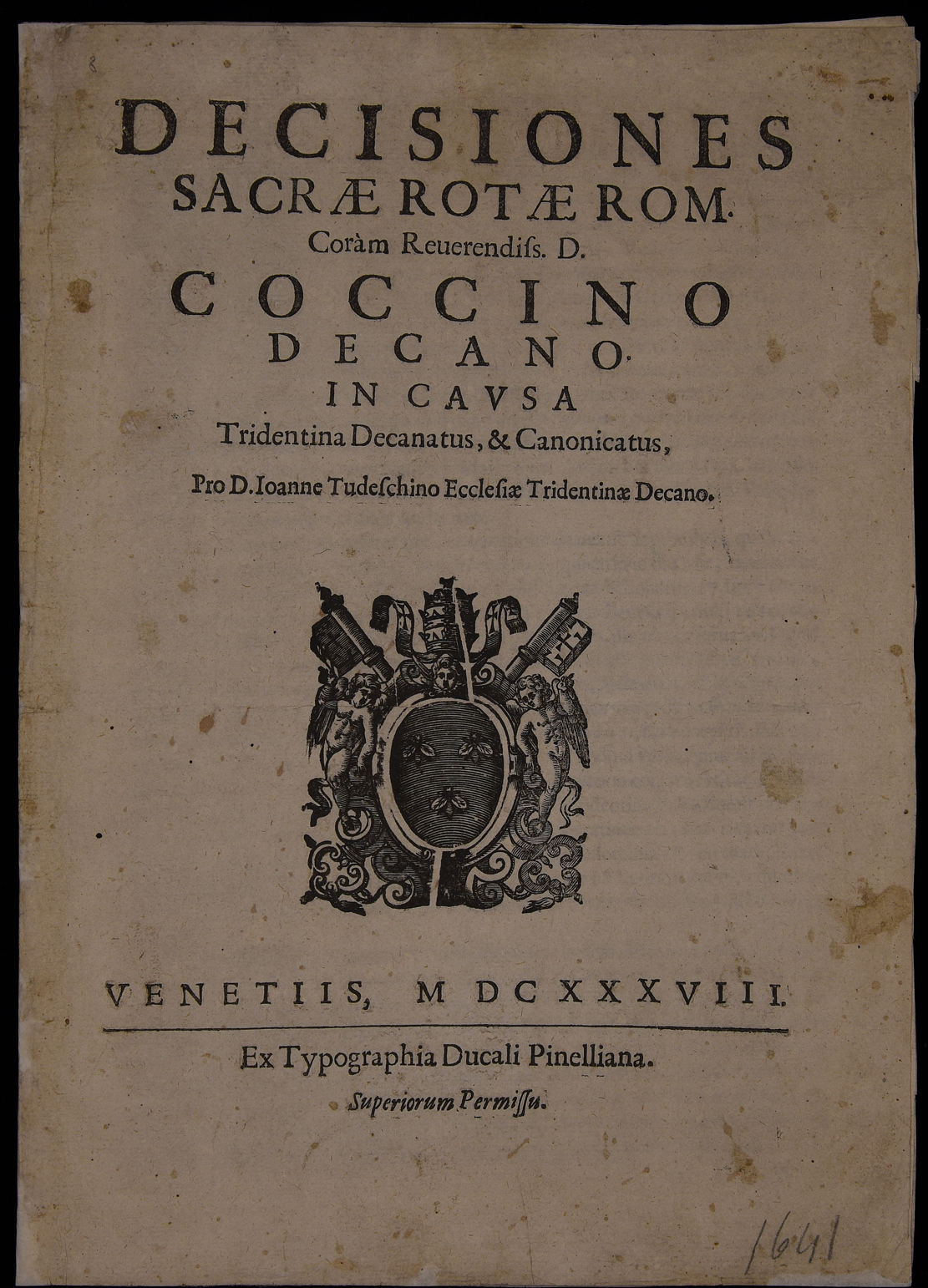 | Decisiones Sacrae Rotae Rom. coràm reverendiss. d. Coccino decano in causa Tridentina decanatus, & canonicatus, pro d. Ioanne Tudeschino Ecclesiae Tridentinae decano |