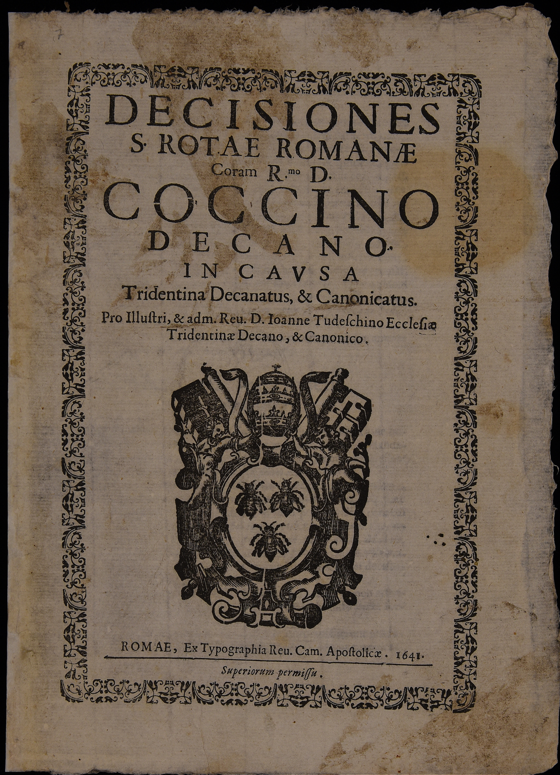 | Decisiones S. Rotae Romanae coram r.mo d. Coccino decano in causa Tridentina decanatus, & canonicatus pro illustri, & adm. rev. d. Ioanne Tudeschino Eccelsiae Tridentinae decano, & canonico |
