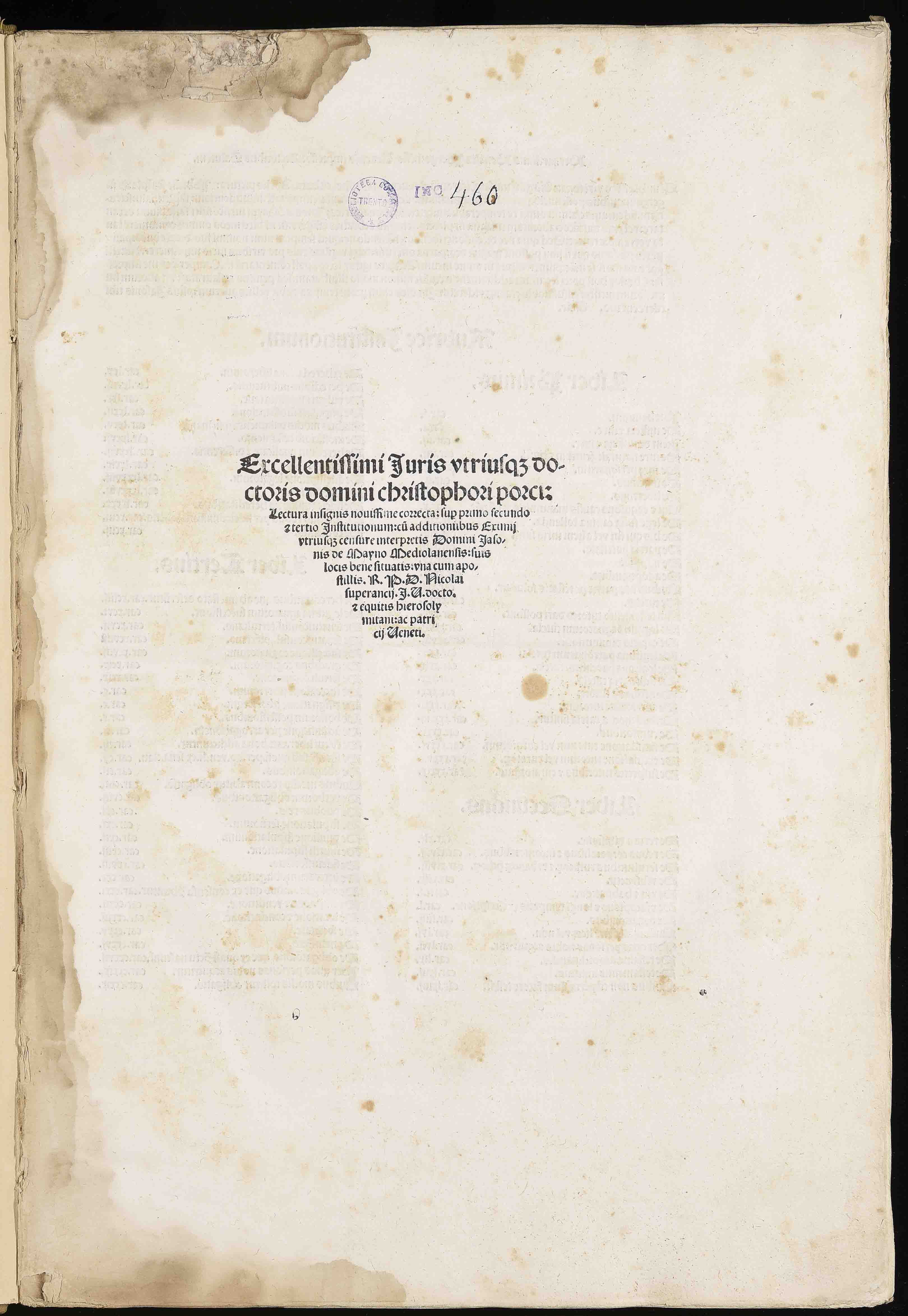 | Excellentissimi iuris utriusque doctoris domini Christophori Porci lectura insignis novissime correcta super primo secundo et tertio institutionum, cum additionibus eximii utriusque censure interpretis domini Iasonis de Mayno mediolanensis suis locis bene situatis una cum apostillis. R. P. D. Nicolai Superancii I. U. docto. et equitis hierosolymitani ac patricii veneti |
