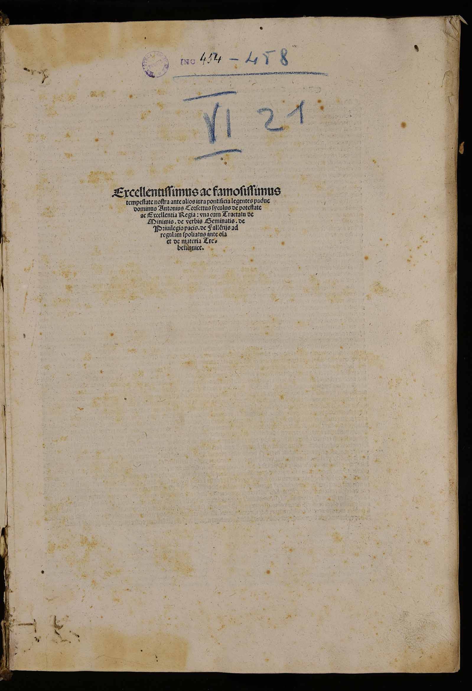 | Excellentissimus ac famosissimus tempestate nostra ante alios iura pontificia legentes padue dominus Antonius Corsettus syculus de potestate ac excellentia regia una cum tractatu de minimis, de verbis geminatis, de privilegio pacis, de fallentiis ad regulam spoliatus ante omnia et de materia trebellianice |