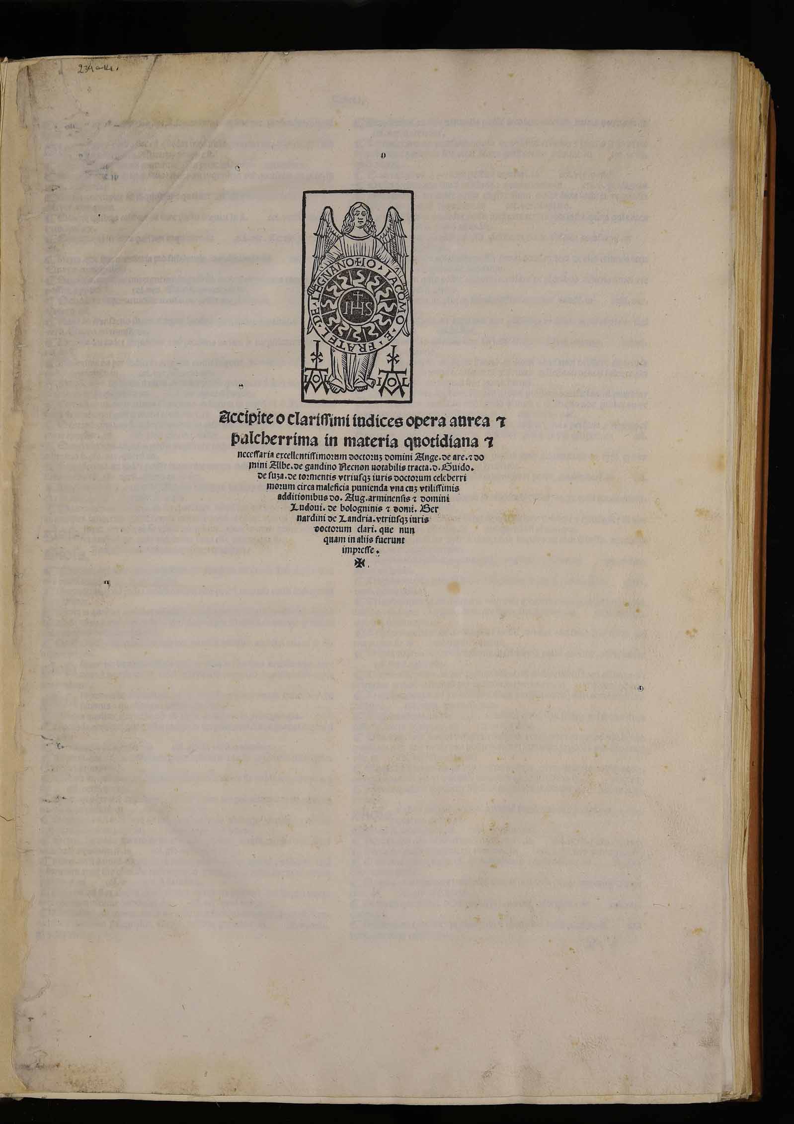 | Accipite o clarissimi iudices opera aurea et pulcherrima in materia quotidiana et necessaria eccellentissimorum doctorum domini Ange. de are. et domini albe. de Gandino necnon notabilis tracta d. Guido de Suza de tormentis utriusque iuris doctorum celeberrimorum circa maleficia punienda una cum utilissimis additionibus d. Aug. Ariminensis et domini Ludovi. de Bologninis et domi. Bernardini de Landria utriusque iuris doctorum clari que nunquam in aliis fuerunt impresse |