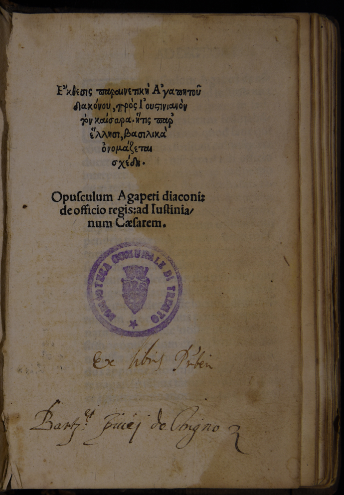 | Ekthesis parainaitike Agapetou diakonou pros Ioustinianov ton kaisara etis par' ellesi basilika onomazetai skede. Opusculum Agapeti diaconi de officio regis ad Iustinianum caesarem |