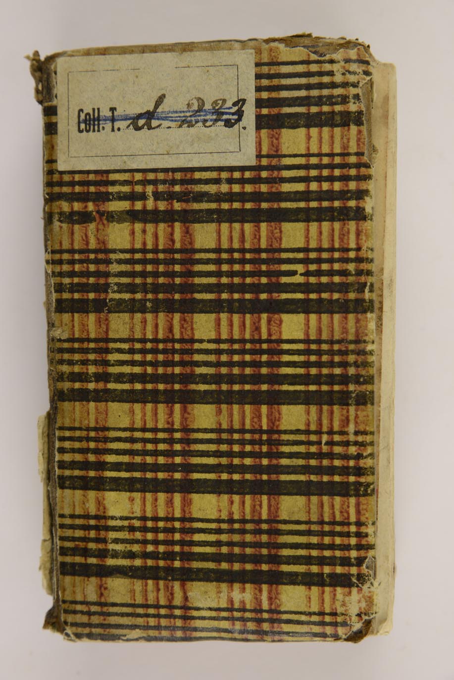 Legato in piena pelle su cartoni con impressioni, con carta policroma incollata, tagli colorati di rosso, c. di guardia ant. e post., mm. 120x65x30, ex libris della Biblioteca al verso del piatto ant., prove di penna al verso della c. di guardia ant., al frontespizio (matita) e a c. Q12v, timbro di Arnaldo Segarizzi a c. *4r, timbri della Biblioteca al recto della c. di guardia e alle cc. *4v e Q12v ), numero d'inventario X/1765 a c. Q12r, provenienza: Arnaldo Segarizzi, antiche segnature di collocazione: Coll. T d 233, TT 4 l 27.