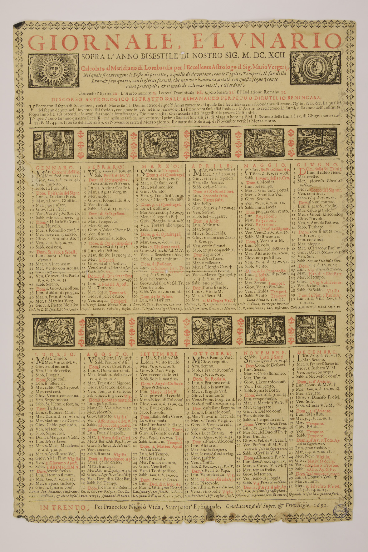 | Giornale, e lunario sopra l'anno bisestile di nostro Sig. MDCXCII. calcolato al meridiano di Lombardia per l'eccellente astrologo il sig. Mario Vergerii. Nel quale si contengono le feste di precetto, e quelle di devotione, con le vigilie, tempore, il far della luna, & suoi quarti ... |