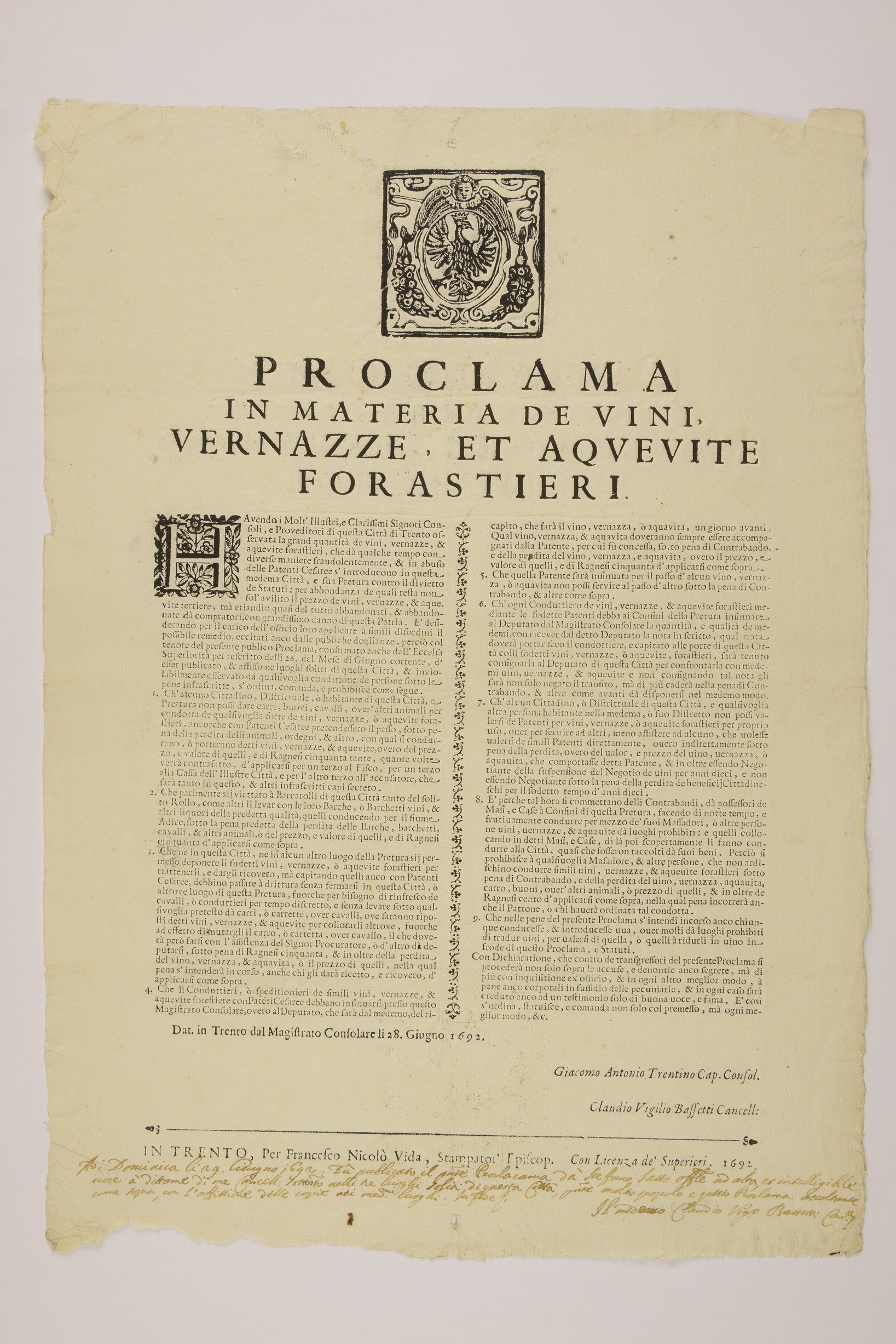 Proclama su vini e grappe emanato il 28 giugno 1692 dal Magistrato consolare di Trento e sottoscritto da Giacomo Antonio Trentino e da Claudio Vigilio Bassetti