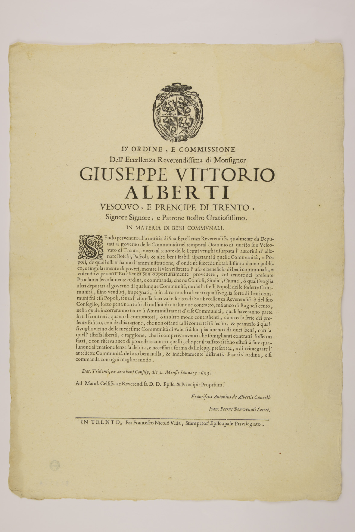 Proclama sui beni comunali emanato il 2 gennaio 1693 da Giuseppe Vittorio Alberti d'Enno, principe-vescovo di Trento, e sottoscritto da Francesco Antonio Alberti e Giovanni Pietro Benvenuti