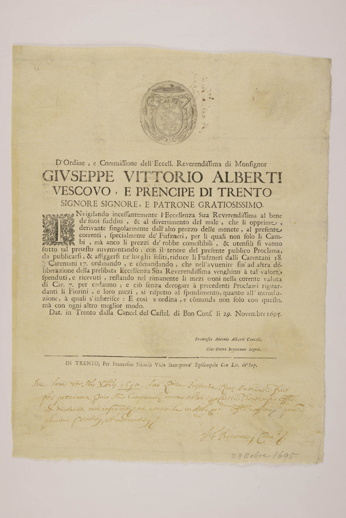 Proclama sulle valute emanato il 29 novembre 1695 da Giuseppe Vittorio Alberti d’Enno, principe-vescovo di Trento, e sottoscritto da Francesco Antonio Alberti e Giovanni Pietro Benvenuti