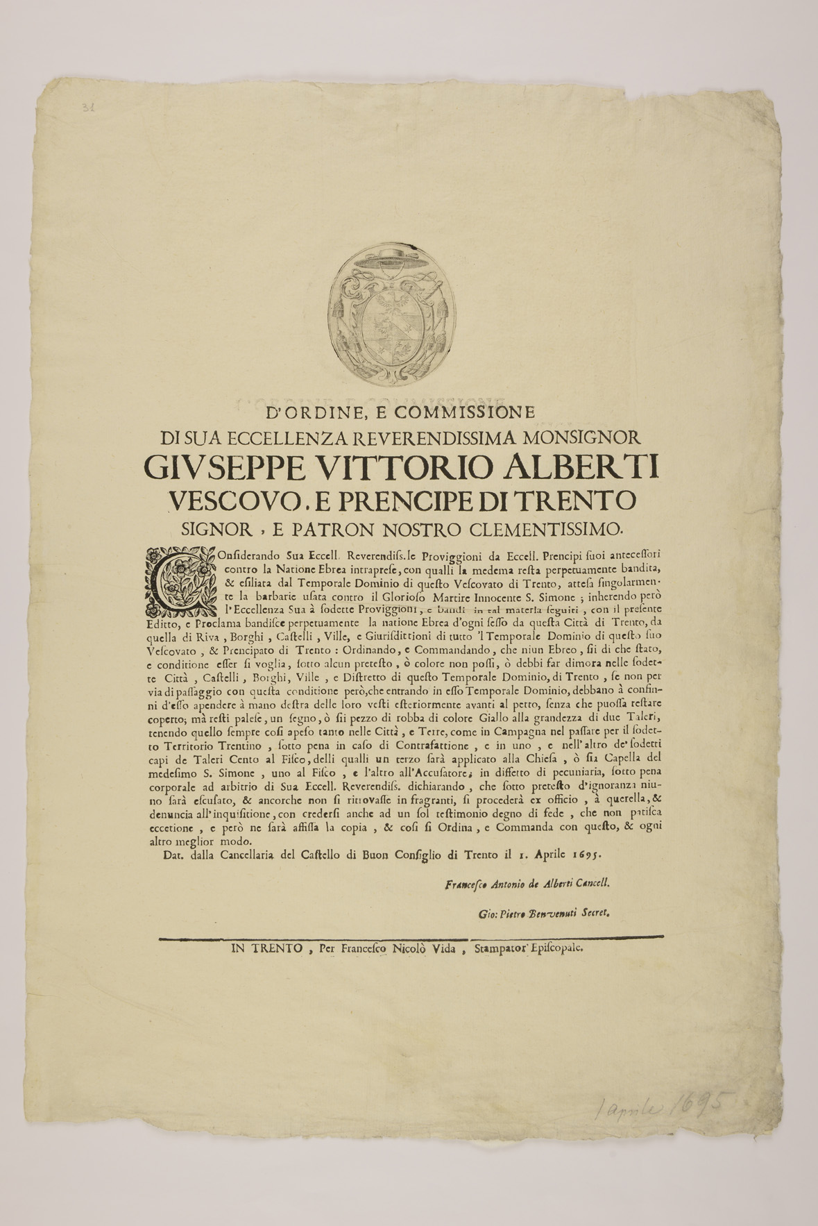 1 manifesto, carattere romano e corsivo, iniziale xilografica, stemma di Giuseppe Vittorio Alberti d’Enno. Proclama contro gli ebrei emanato l'1 aprile 1695 da Giuseppe Vittorio Alberti d’Enno, principe-vescovo di Trento, e sottoscritto da Francesco Antonio Alberti e Giovanni Pietro Benvenuti. Filigrana con monogramma BM (?) con trifoglio e marca in parte non distinguibile, dal disegno complesso, identica a quella dell'edizione STABAT 338, impossibile da confrontare con il repertorio Chemelli stante i dati insufficienti.