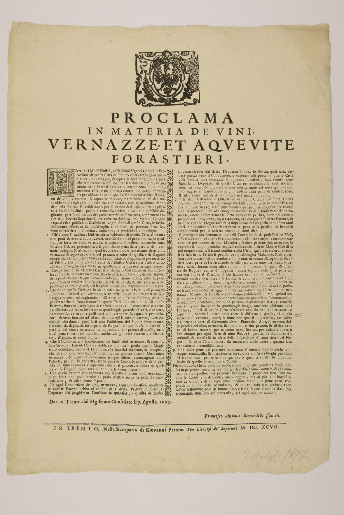 Proclama su vini e grappe emanato il 7 agosto 1697 dal Magistrato consolare di Trento e sottoscritto da Francesco Antonio Bernardelli