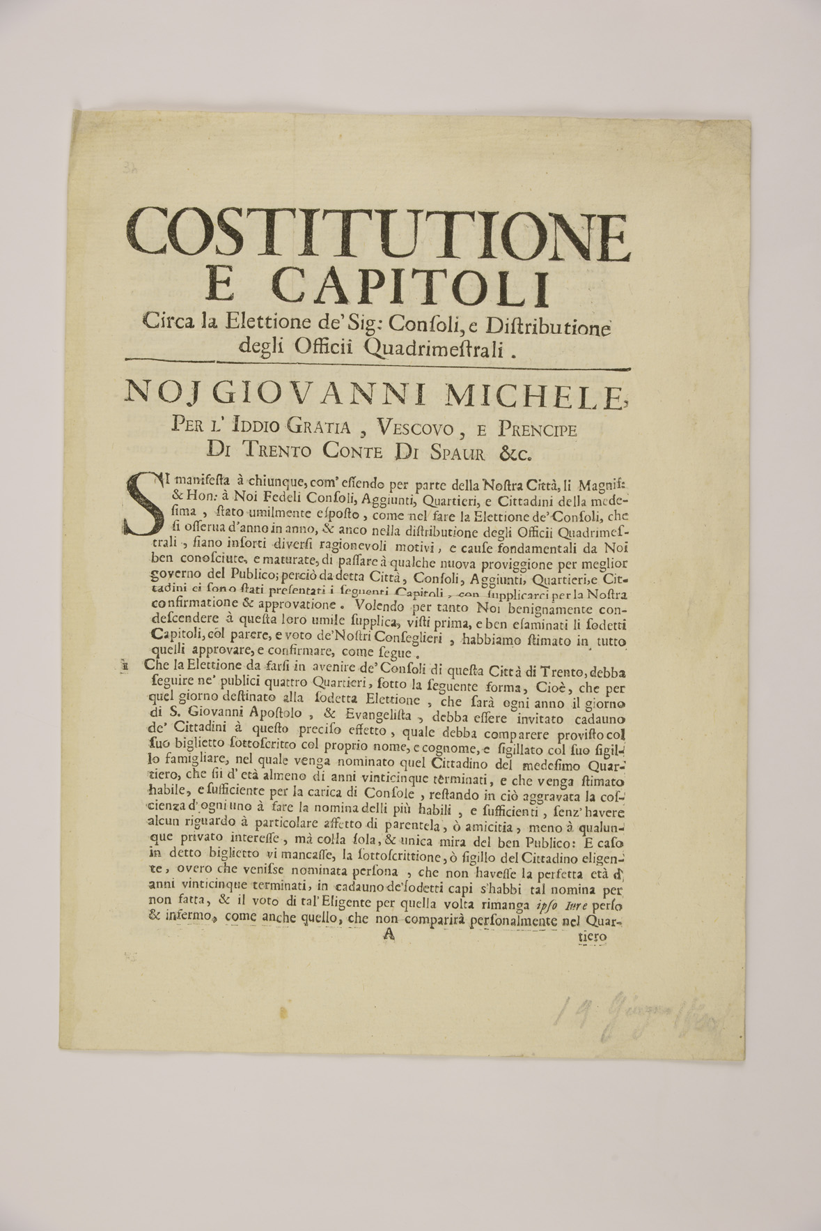 Proclama sull'elezione dei consoli emanato il 31 maggio 1700 da Giovanni Michel Spaur, principe-vescovo di Trento, sottoscritto da Francesco Antonio Alberti e Bernardino Manci, pubblicato da Antonio Sizzo, cui segue (c. A2v) la richiesta al principe-vescovo da parte dei Quartieri di questa su città di Trento di stampare il testo del bando e l'autorizzazione del 19 giugno 1700 sottoscritta da Bernardino Manci