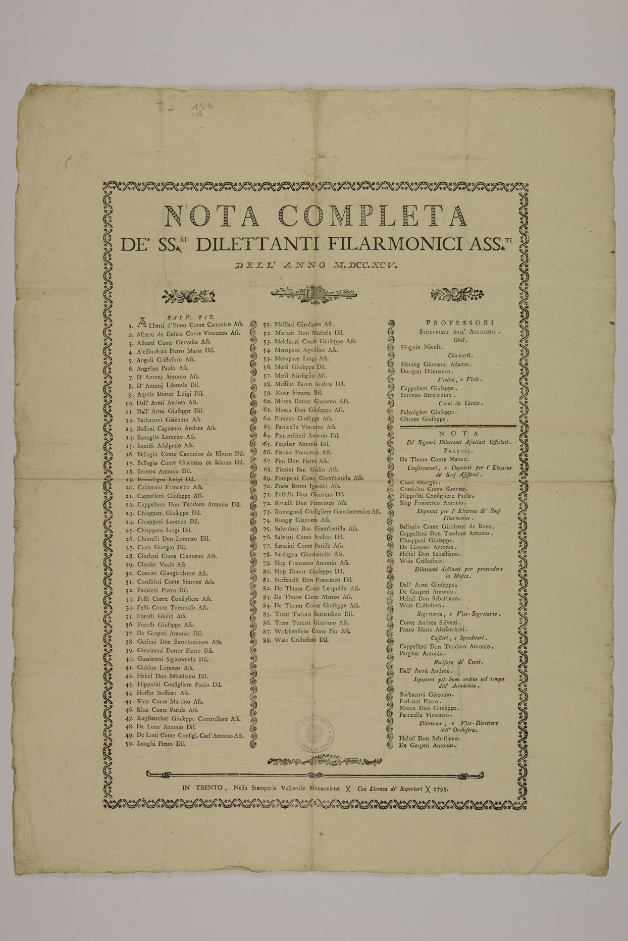 1 foglio, carattere romano e corsivo, fregi tipografici, testo in cornice tipografica. Contiene l'elenco della società filarmonica dell'anno 1795.