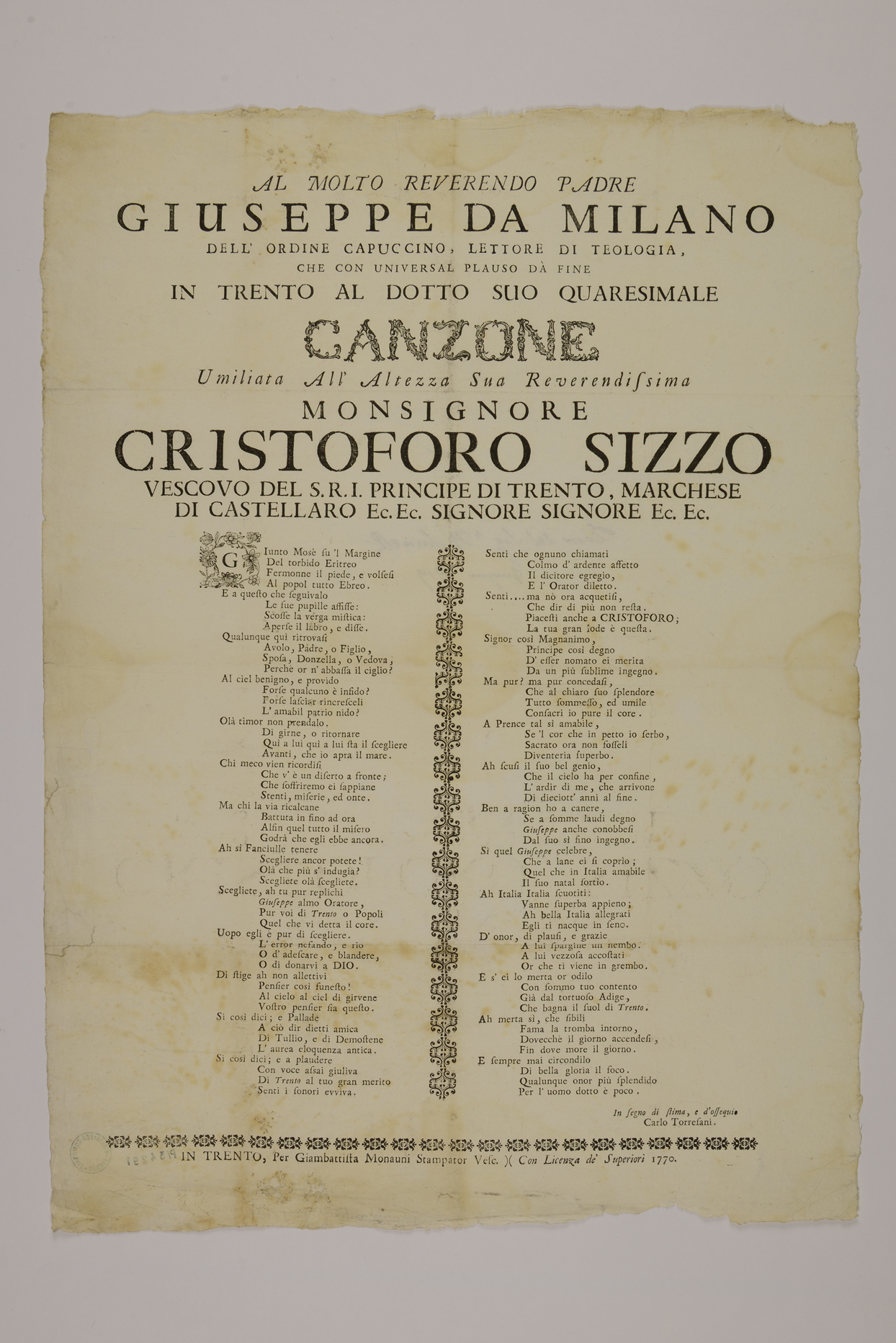 | Al molto reverendo padre Giuseppe da Milano dell'ordine Capuccino, lettore di teologia, che con universal plauso dà fine in Trento al dotto suo quaresimale, canzone umiliata all'altezza sua reverendissima monsignore Cristoforo Sizzo vescovo del S.R.I. principe di Trento, marchese de Castellaro ec. ec. signore signore ec. ec. |