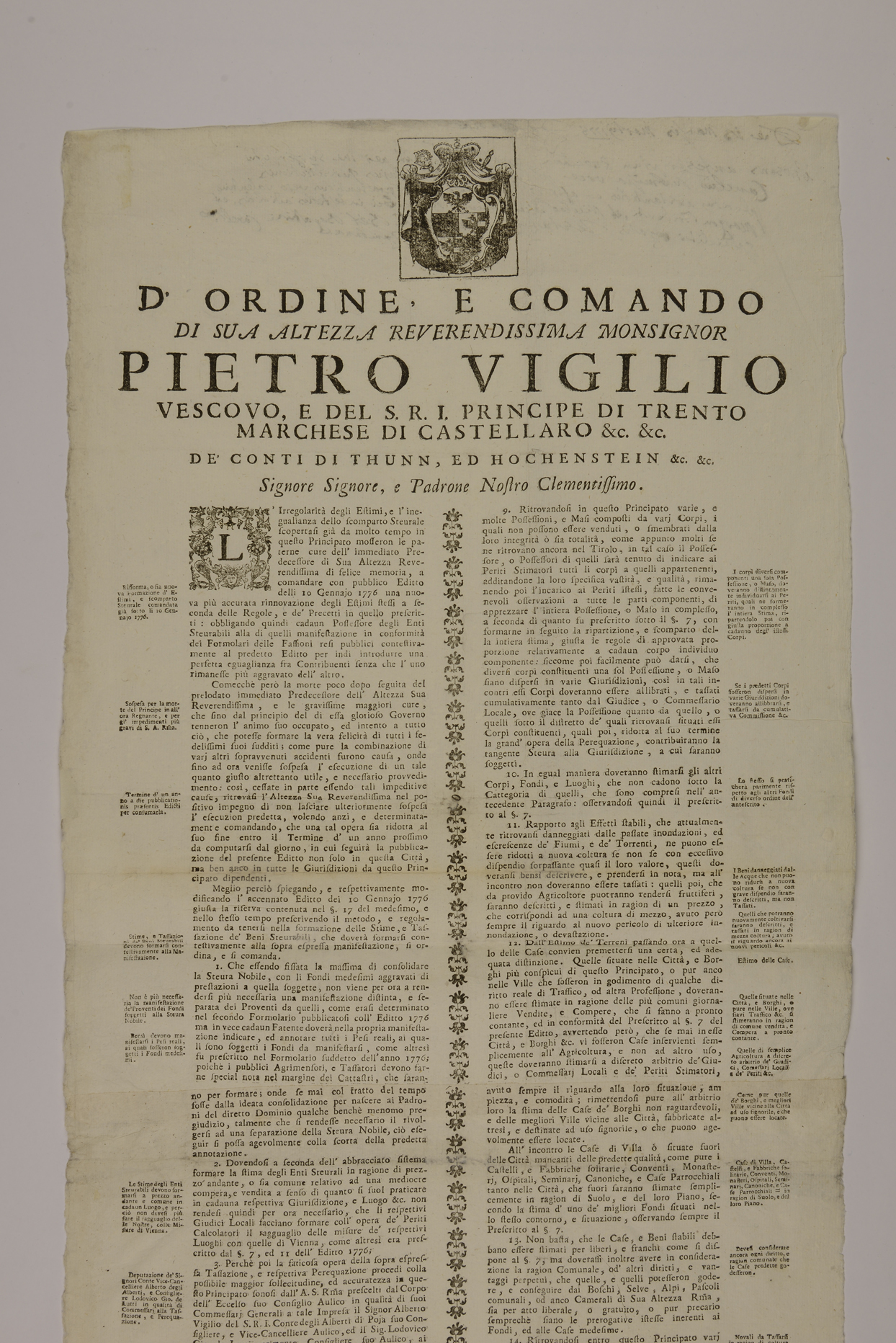 | D'ordine, e comando di sua altezza reverendissima monsignor Pietro Vigilio vescovo, e del S.R.I. principe di Trento marchese di Castellaro &c. &c. de' conti Thunn, ed Hochenstein &c. &c. signore signore, e padrone nostro clementissimo |