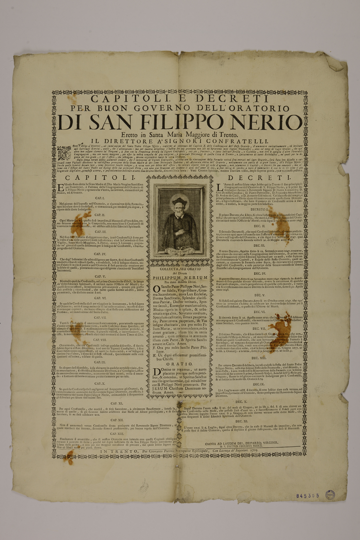| Capitoli, e decreti per buon governo dell'oratorio di San Filippo Nerio eretto in Santa Maria Maggiore di Trento. Il direttore a' signori confratelli |