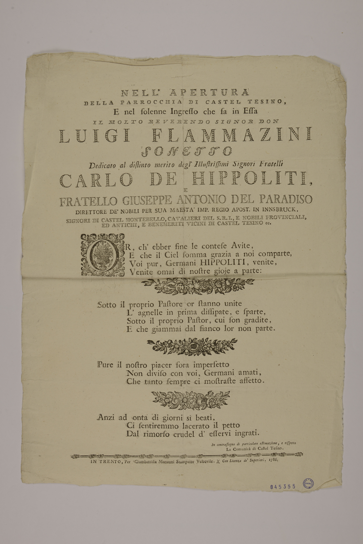 | Nell’apertura della parrocchia di Castel Tesino, e nel solenne ingresso che fa in essa il molto reverendo signor don Luigi Flammazzini, sonetto dedicato al distinto merito degl’illustrissimi signori fratelli Carlo de Hippoliti, e fratello Giuseppe Antonio Del Paradiso direttore de’ nobili per sua maestà imp. regio apost. in Innsbruck, signori di castel Montebello, cavalieri del S.R.I, e nobili provinciali, ed antichi, e benemeriti vicini di Castel Tesino ec. |
