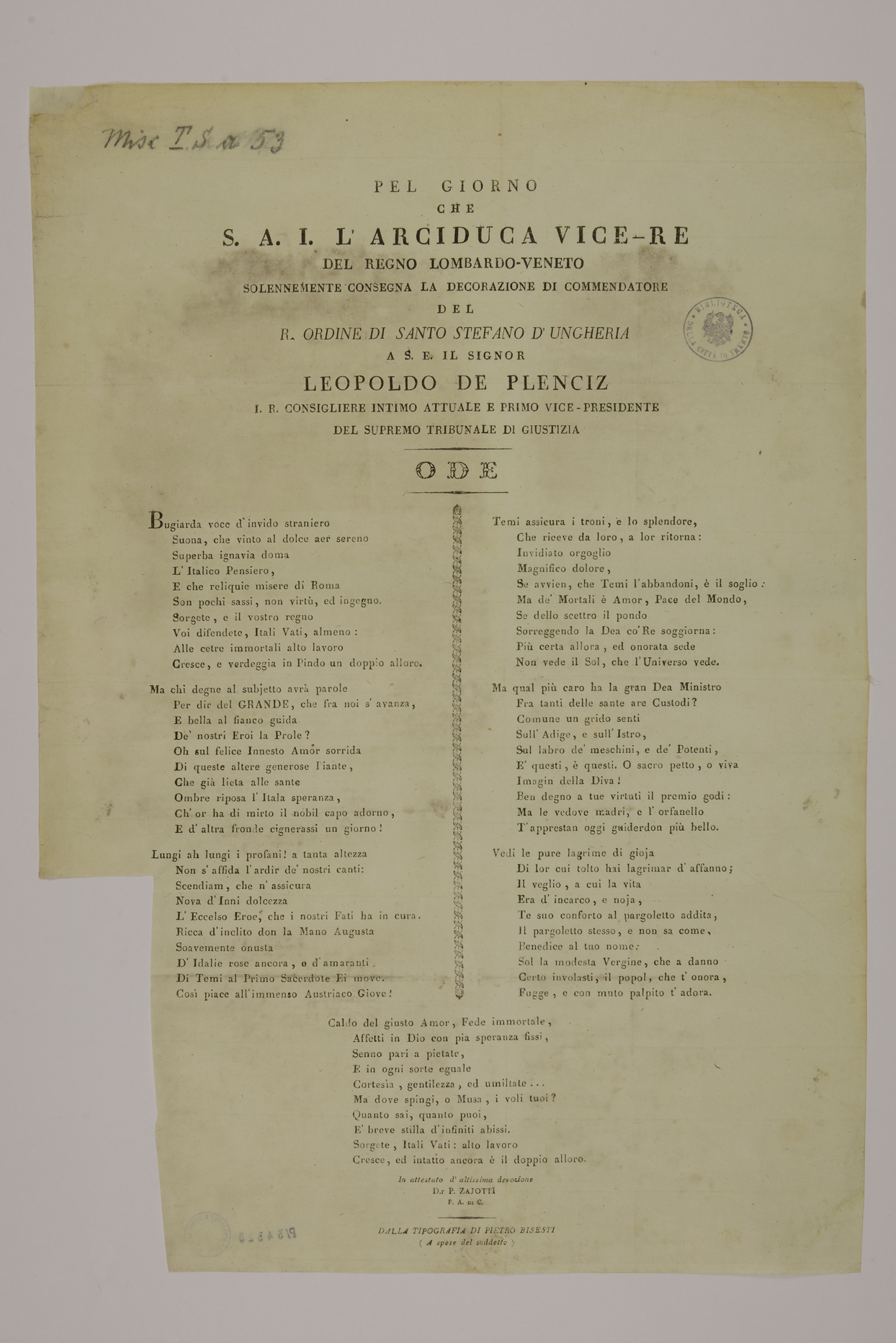 | Pel giorno che S.A.I. l'arciduca vice-re del regno lombardo-veneto solennemente consegna la decorazione di commendatore del r. ordine di Santo Stefano d'Ungheria a S.E. il signor Leopoldo de Plenciz I.R. consigliere intimo attuale e primo vice-presidente del supremo tribunale di giustizia, ode |