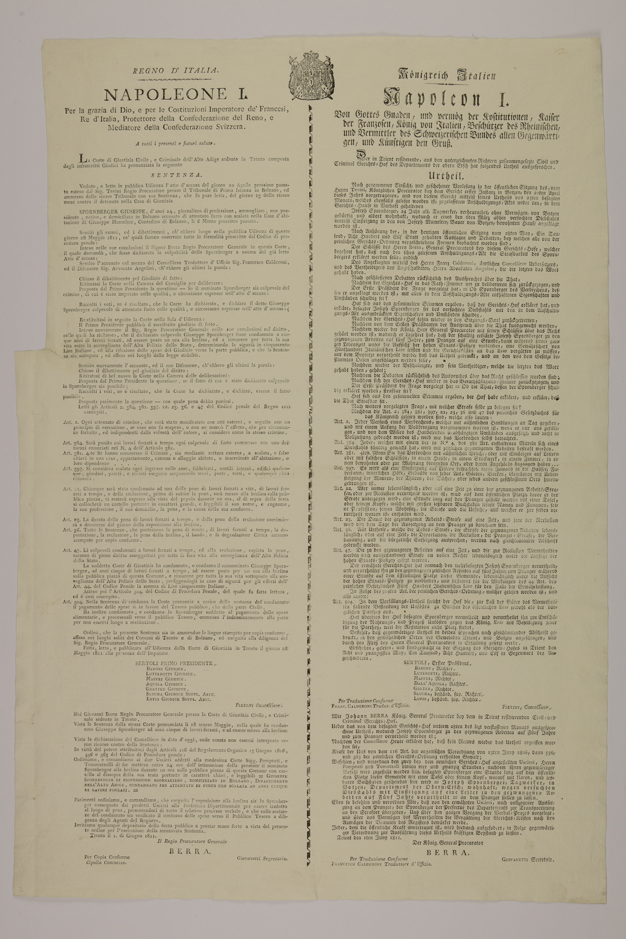 La Corte di Giustizia civile, e criminale dell'Alto Adige sedente in Trento composta dagli infrascritti giudici ha pronunziata la seguente sentenza ...