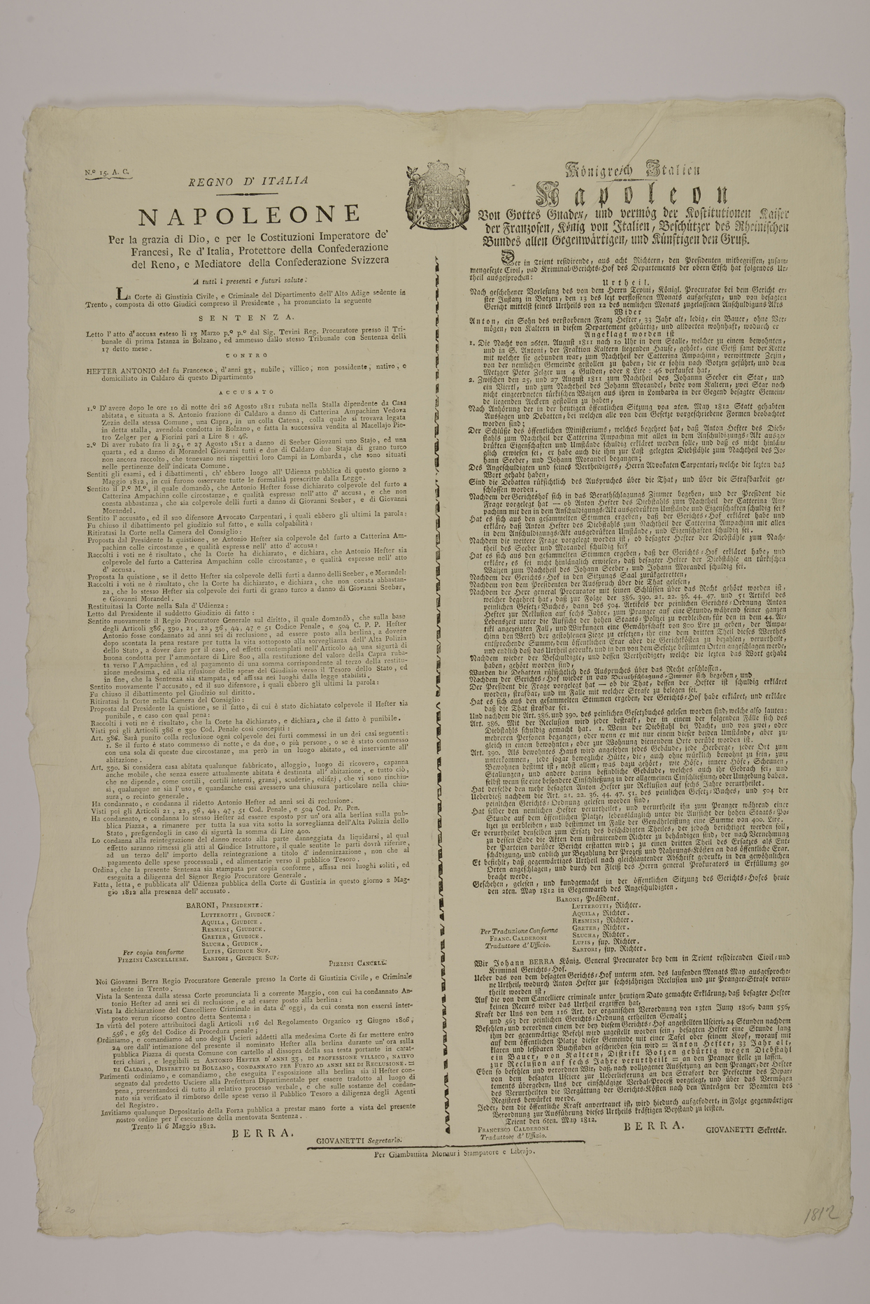La Corte di Giustizia civile, e criminale del Dipartimento dell'Alto Adige sedente in Trento, composta di otto giudici compreso il presidente, ha pronunciato la seguente sentenza ...