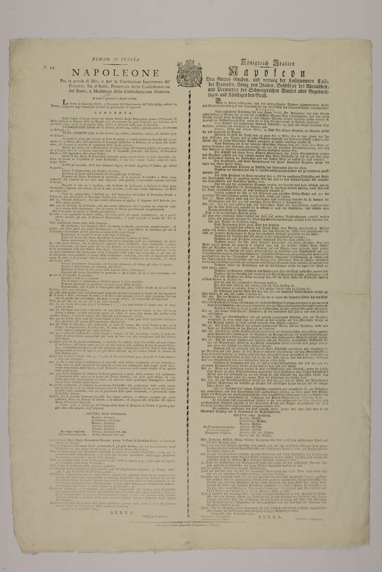 La Corte di Giustizia civile, e criminale del Dipartimento dell'Alto Adige sedente in Trento, composta dagl'infrascritti giudici ha pronunciata la seguente sentenza ...