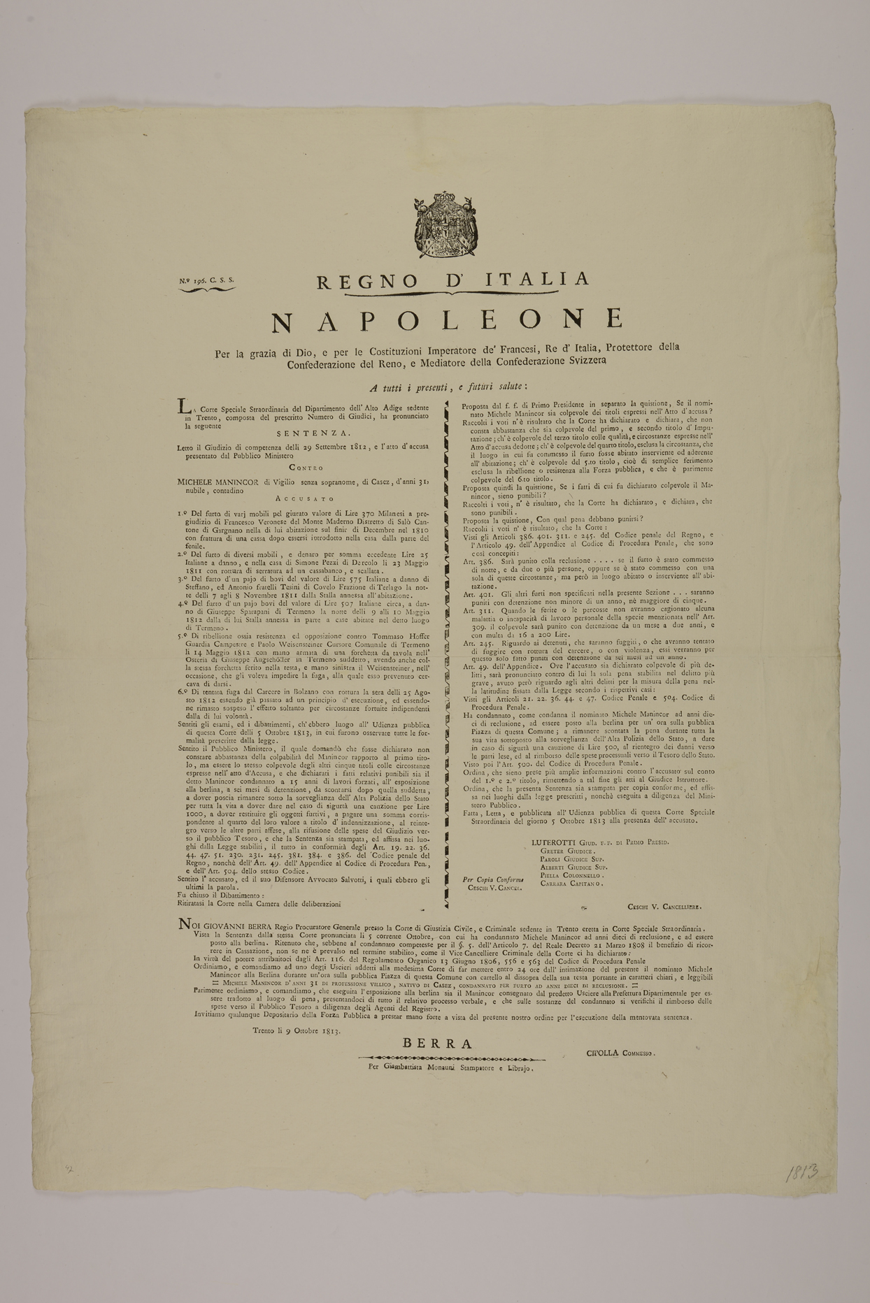 | Napoleone per la grazia di Dio, e per le costituzioni Imperatore de' francesi, re d'Italia, protettore della Confederazione del Reno, e mediatore della Confederazione Svizzera. A tutti i presenti, e futuri salute |