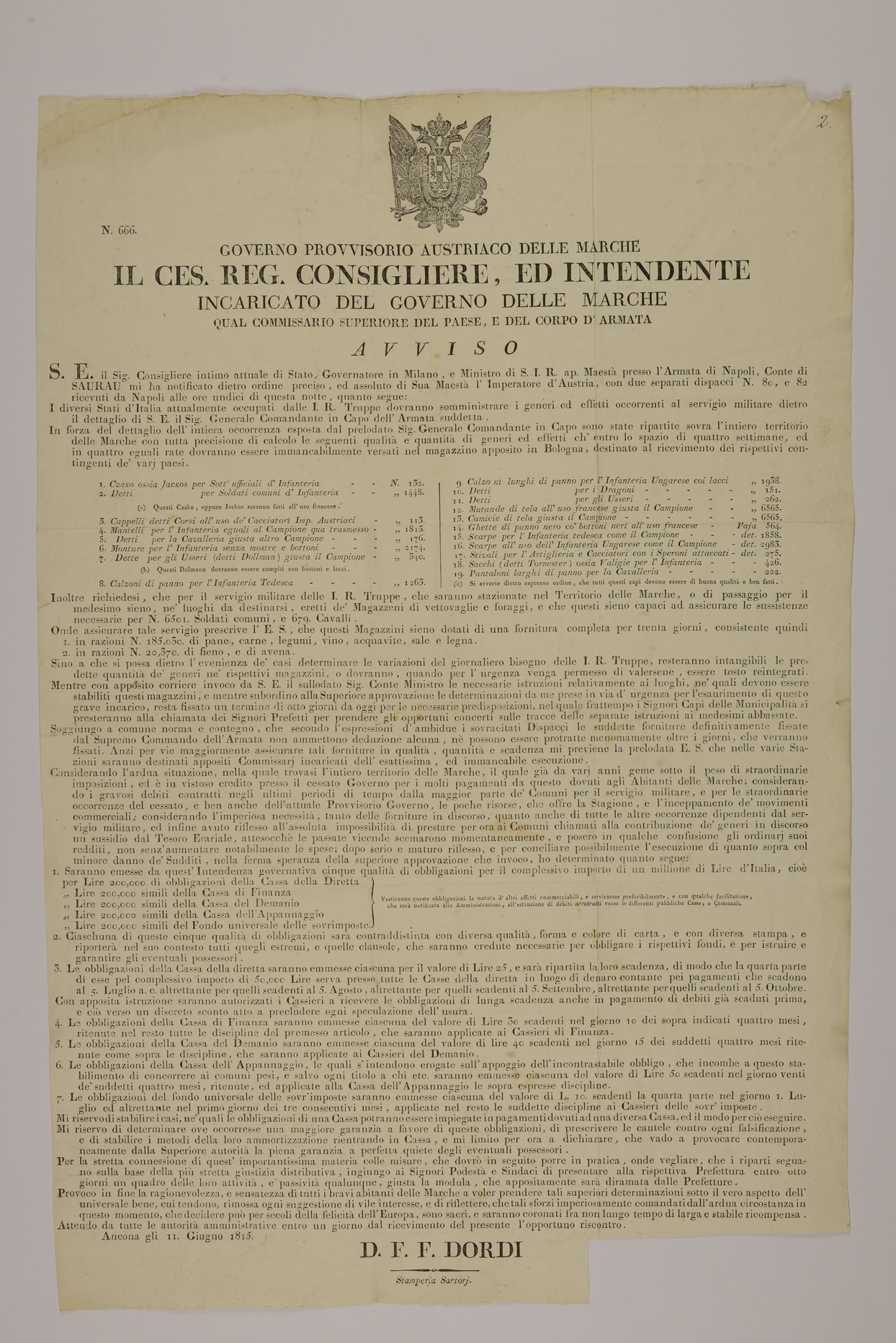 | Il ces. reg. consigliere, ed intendente incaricato del governo delle Marche qual commissario superiore del Paese, e del corpo d'armata, avviso |