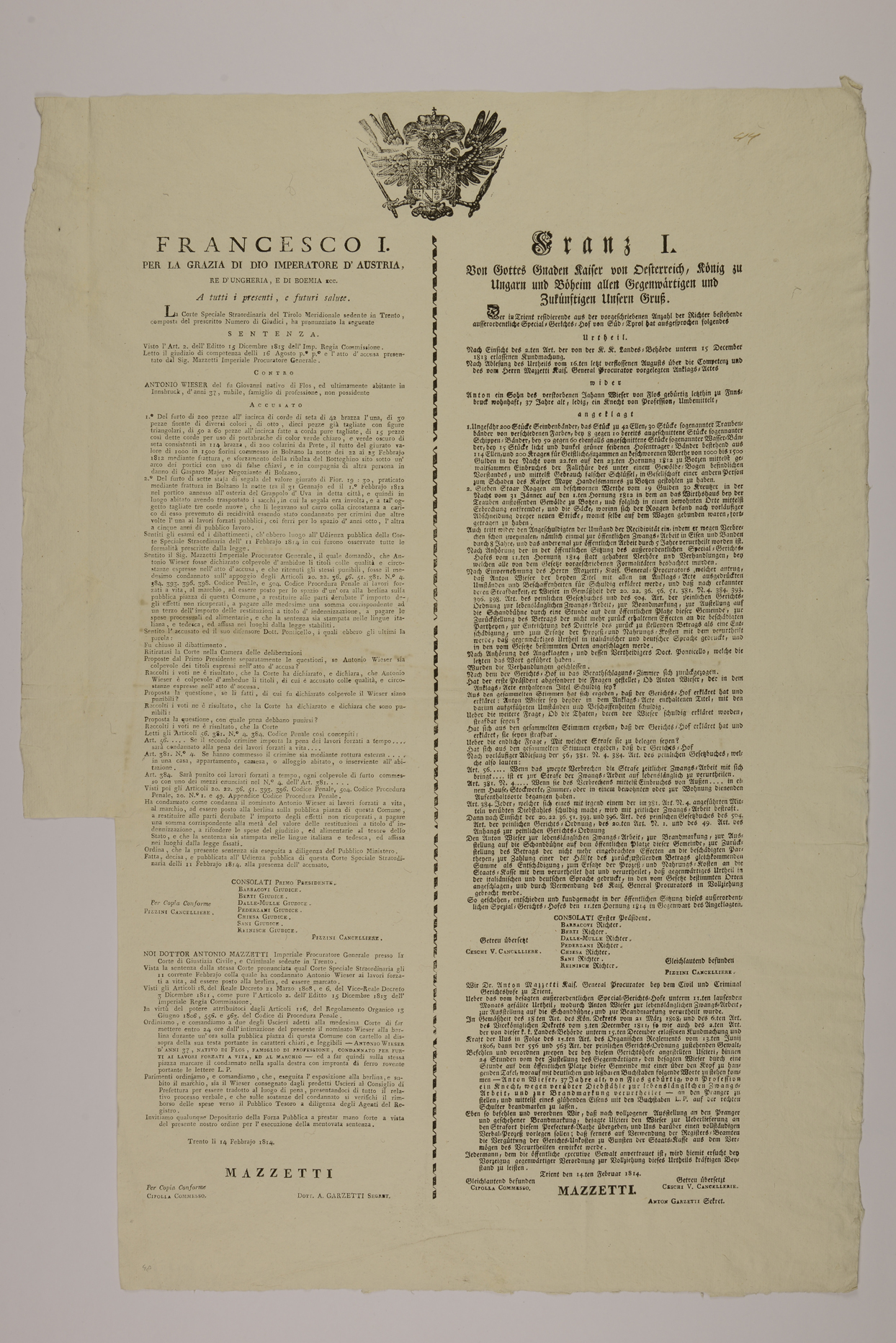 Francesco I. per la grazia di Dio Imperatore d'Austria, re d'Ungheria, e di...