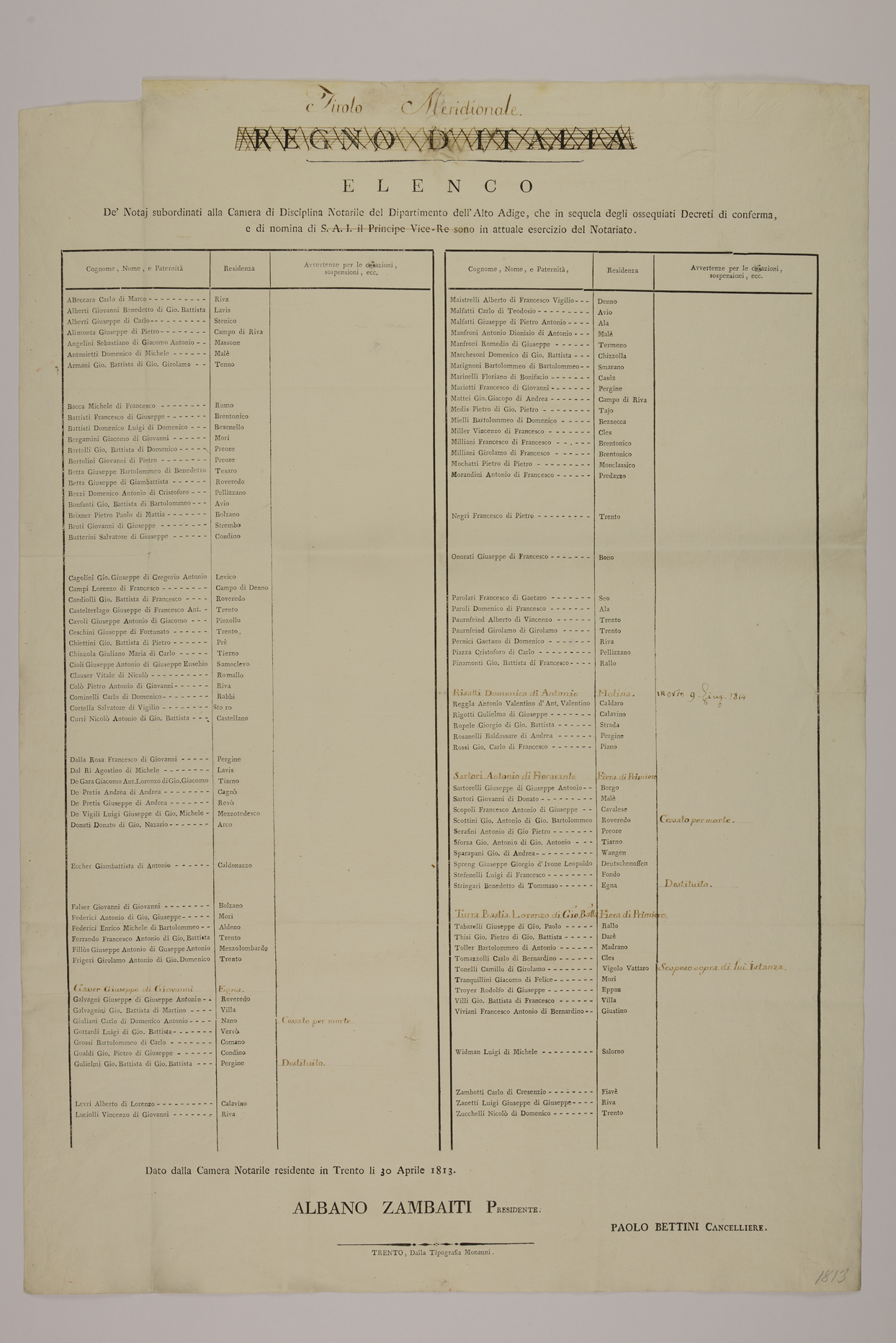| Elenco de' notaj subordinati alla Camera di Disciplina notarile del Dipartimento dell'Alto Adige, che in sequela degli ossequiati decreti di conferma, e di domina di S.A.I. il principe vice-re sono in attuale esercizio del notariato |