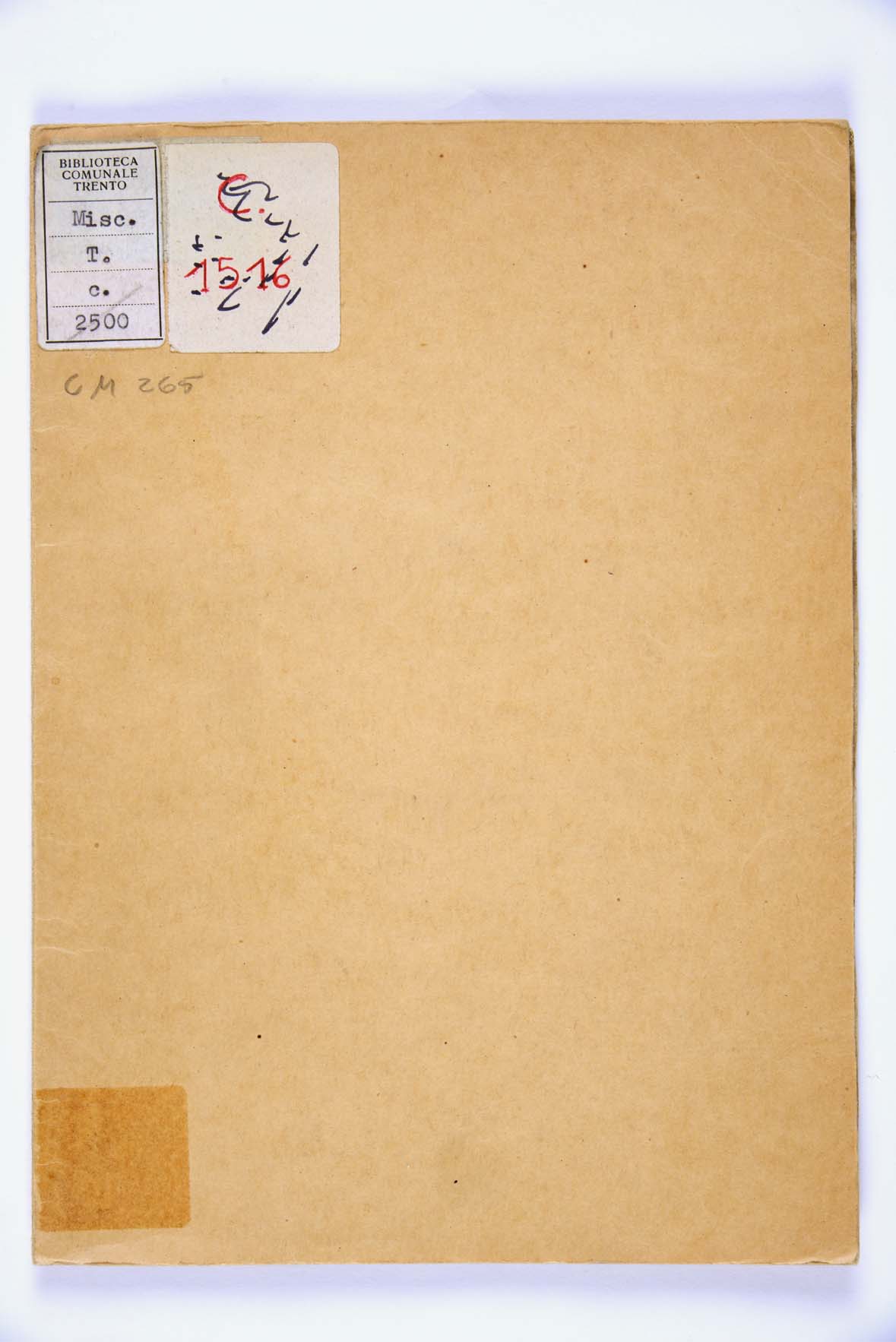 Nota di possesso al frontespizio: Ioannis Albani Giovanelli I.U.D., timbro della Biblioteca al frontespizio e a c. b6v, ex-libris della Biblioteca sul verso del piatto anteriore. Legatura provvisoria in cartoncino giallo, mm. 220x160. Provenienza Mazzetti, antiche segnature di collocazione: 25 (sul frontespizio, Mazzetti [?]), misc T c 2500, G 2 op f 199 (Biblioteca comunale di Trento). Numero d’inventario della Biblioteca comunale di Trento: P/12957 a c. b6v.