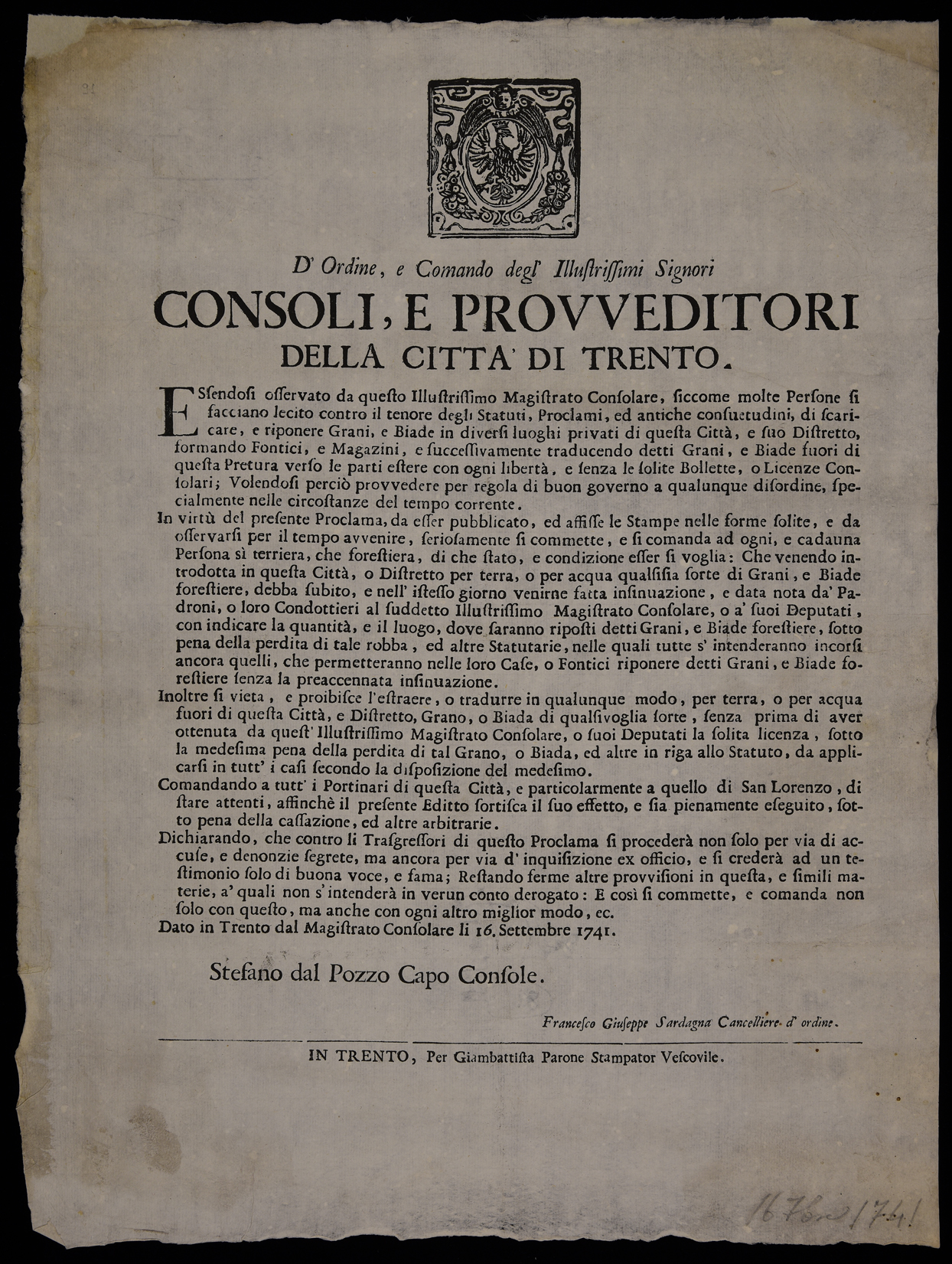Proclama sull'importazione ed esportazione di grano e biade emanato il 16 settembre 1741 del Magistrato consolare di Trento, stemma del Magistrato consolare di Trento, sottoscritto dal capo console Stefano Dal Pozzo e dal cancelliere Francesco Giuseppe Sardagna