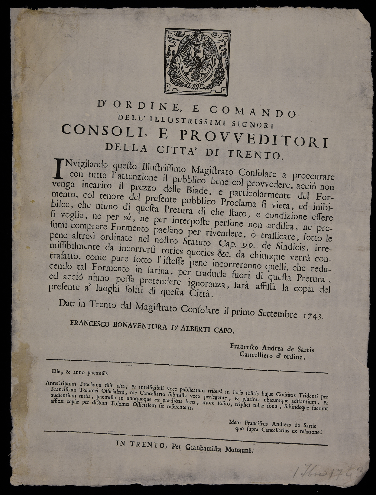 Proclama sul commercio del grano e della farina emanato il 1 settembre 1743 dal Magistrato consolare di Trento, stemma del Magistrato consolare di Trento, sottoscritto da Francesco Bonaventura Alberti (capo) e da Francesco Andrea De Sartis (cancelliere).
