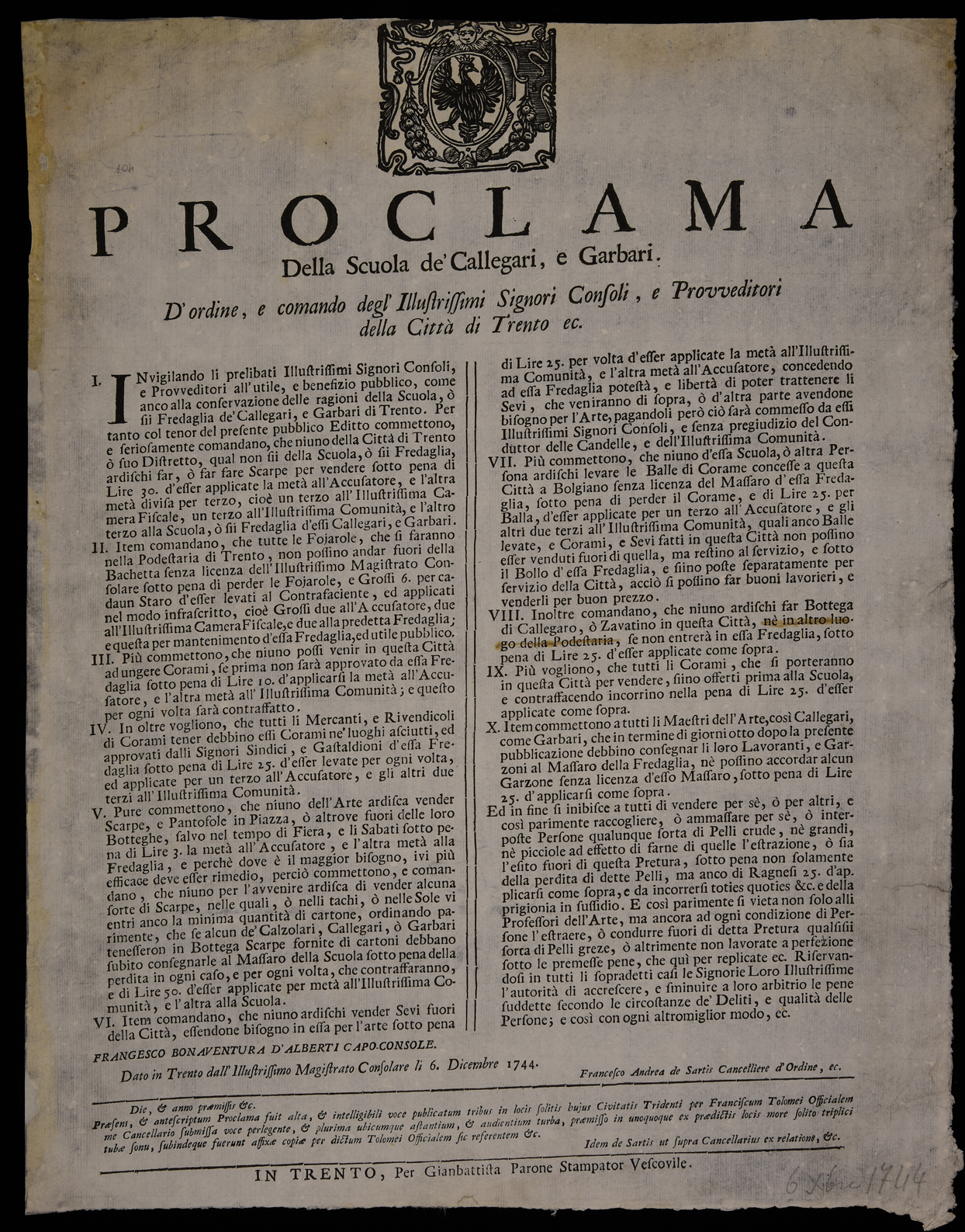 | Proclama della scuola de' callegari, e garbari. D'ordine, e comando degl'illustrissimi signori consoli, e provveditori della città di Trento ec. |