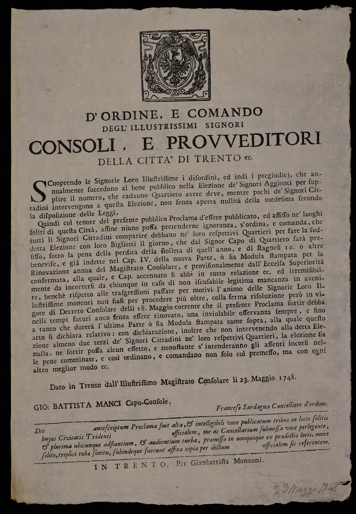 Proclama sull'elezione dell'Aggiunta emanato il 23 maggio 1748 dal Magistrato consolare di Trento, stemma del Magistrato consolare di Trento, sottoscritto da Giovanni Battista Manci (capo console) e da Francesco Sardagna (cancelliere)