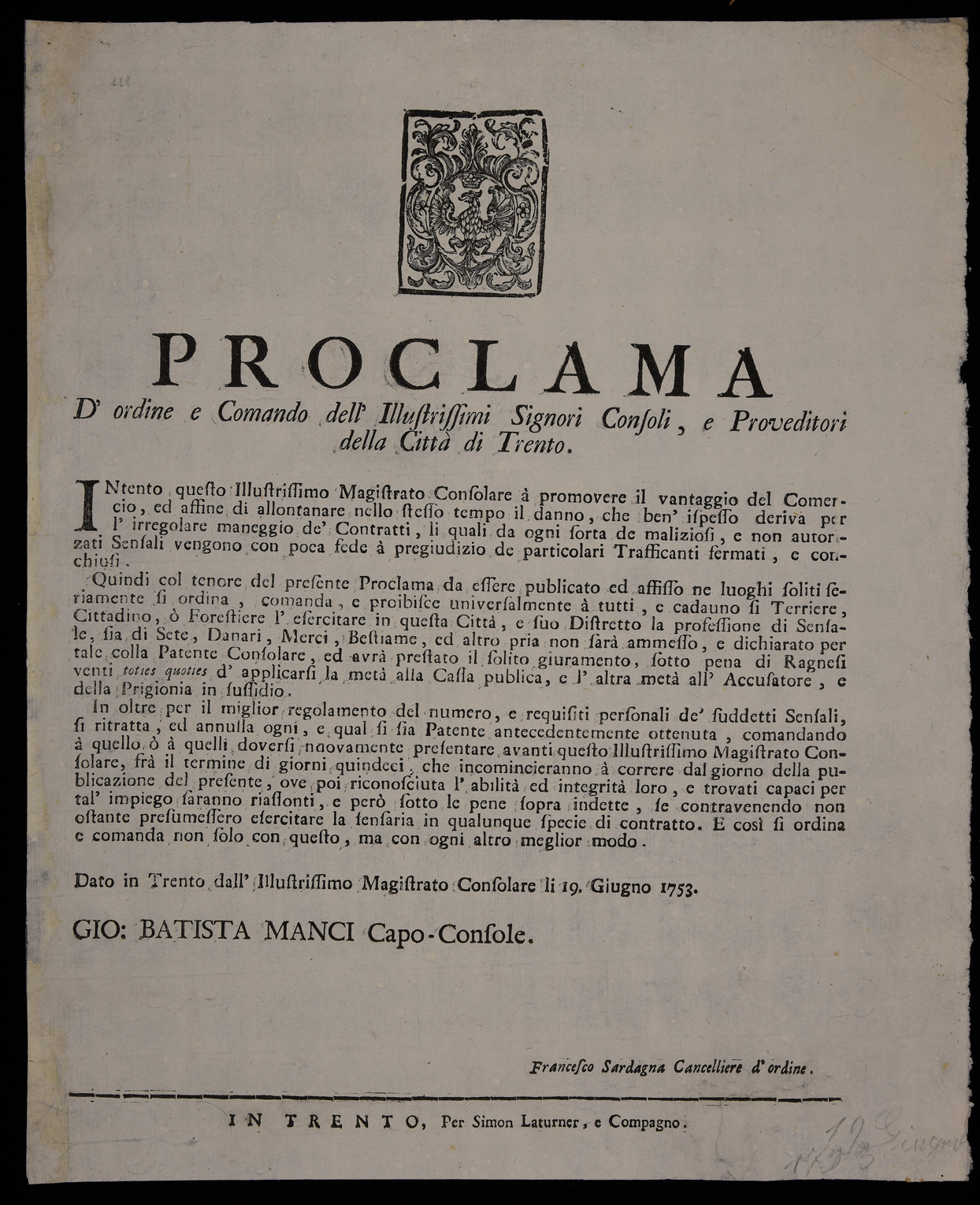 Proclama sul commercio emanato il 19 giugno 1753 dal Magistrato consolare di Trento, stemma del Magistrato consolare di Trento, sottoscritto da Giovanni Battista Manci (capo console) e da Francesco Sardagna (cancelliere).