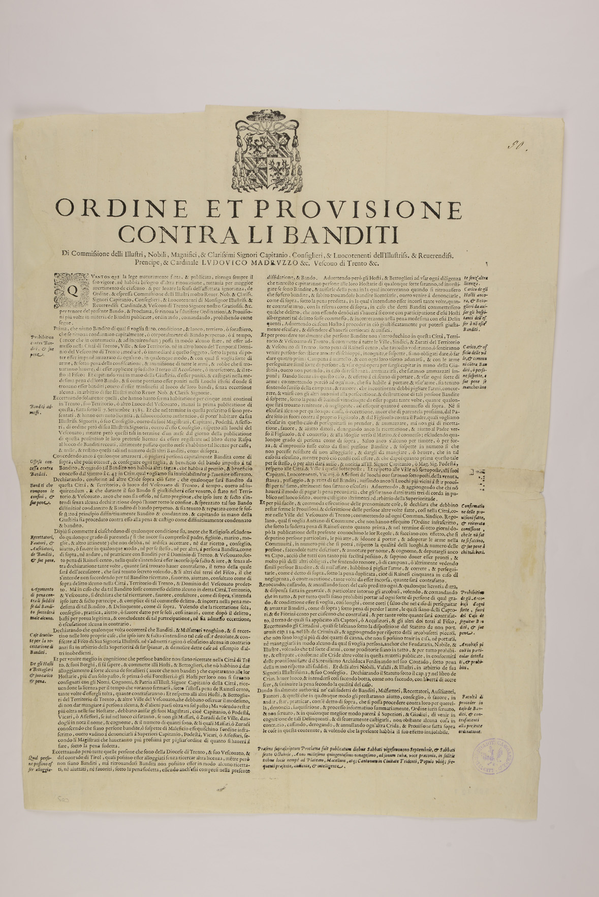 Proclama contro i banditi pubblicato il 29 settembre e il 6 ottobre 1590 da Lodovico Madruzzo, principe-vescovo di Trento