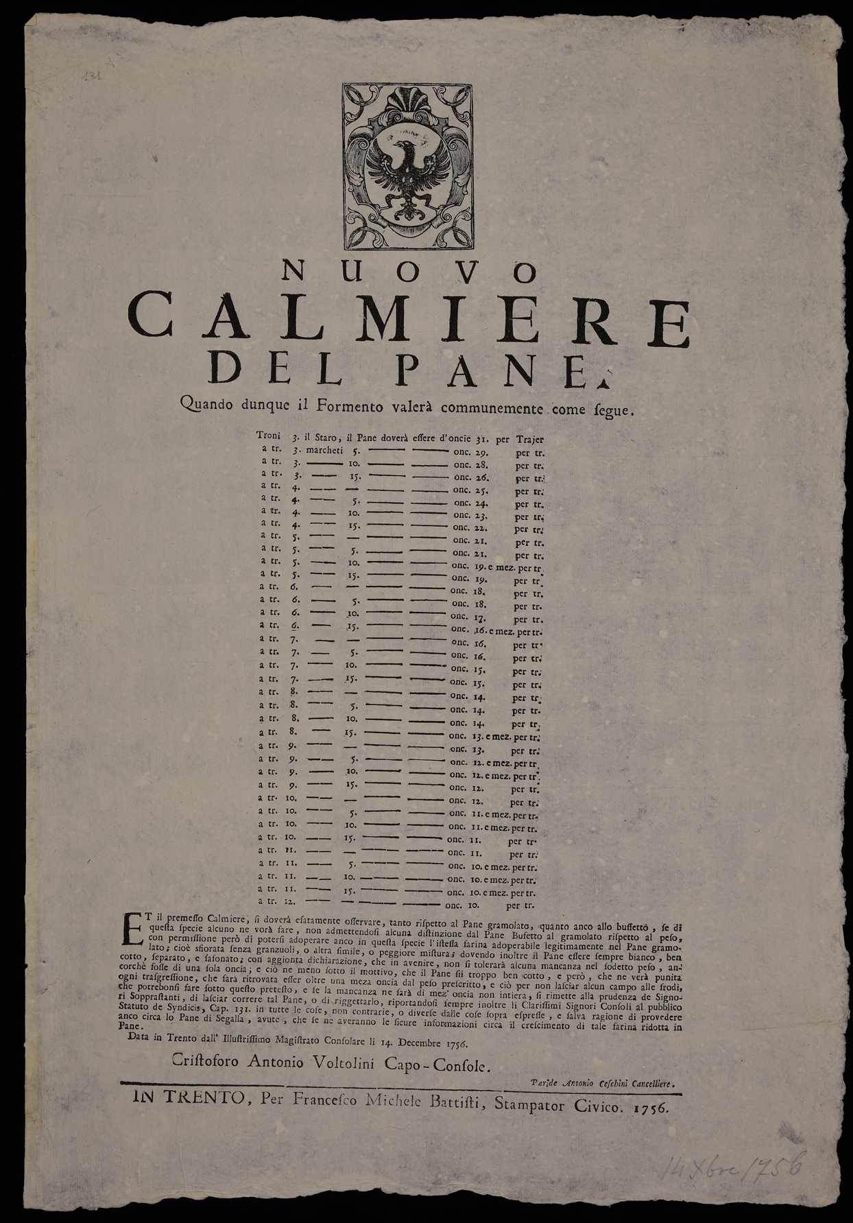 Proclama sul prezzo del pane emanato il 14 dicembre 1756 dal Magistrato consolare di Trento, stemma del Magistrato consolare di Trento, sottoscritto da Cristoforo Antonio Voltolini (capo-console) e da Paride Antonio Ceschini (cancelliere).