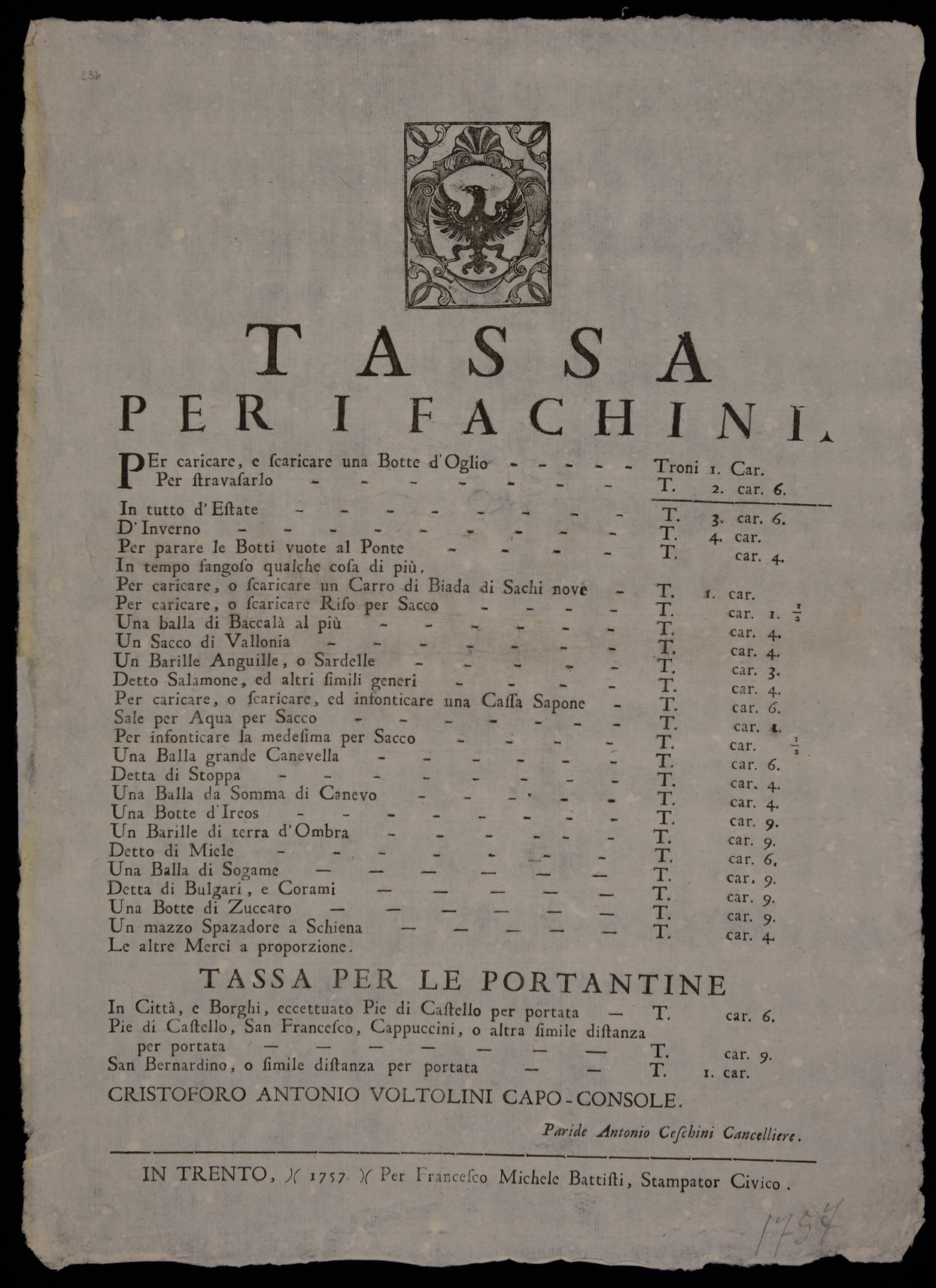 Proclama che stabilisce il prezzo dei lavori di facchinaggio emanato nel 1757 dal Magistrato consolare di Trento, stemma del Magistrato consolare di Trento, sottoscritto da Cristoforo Antonio Voltolini e Paride Antonio Ceschini.