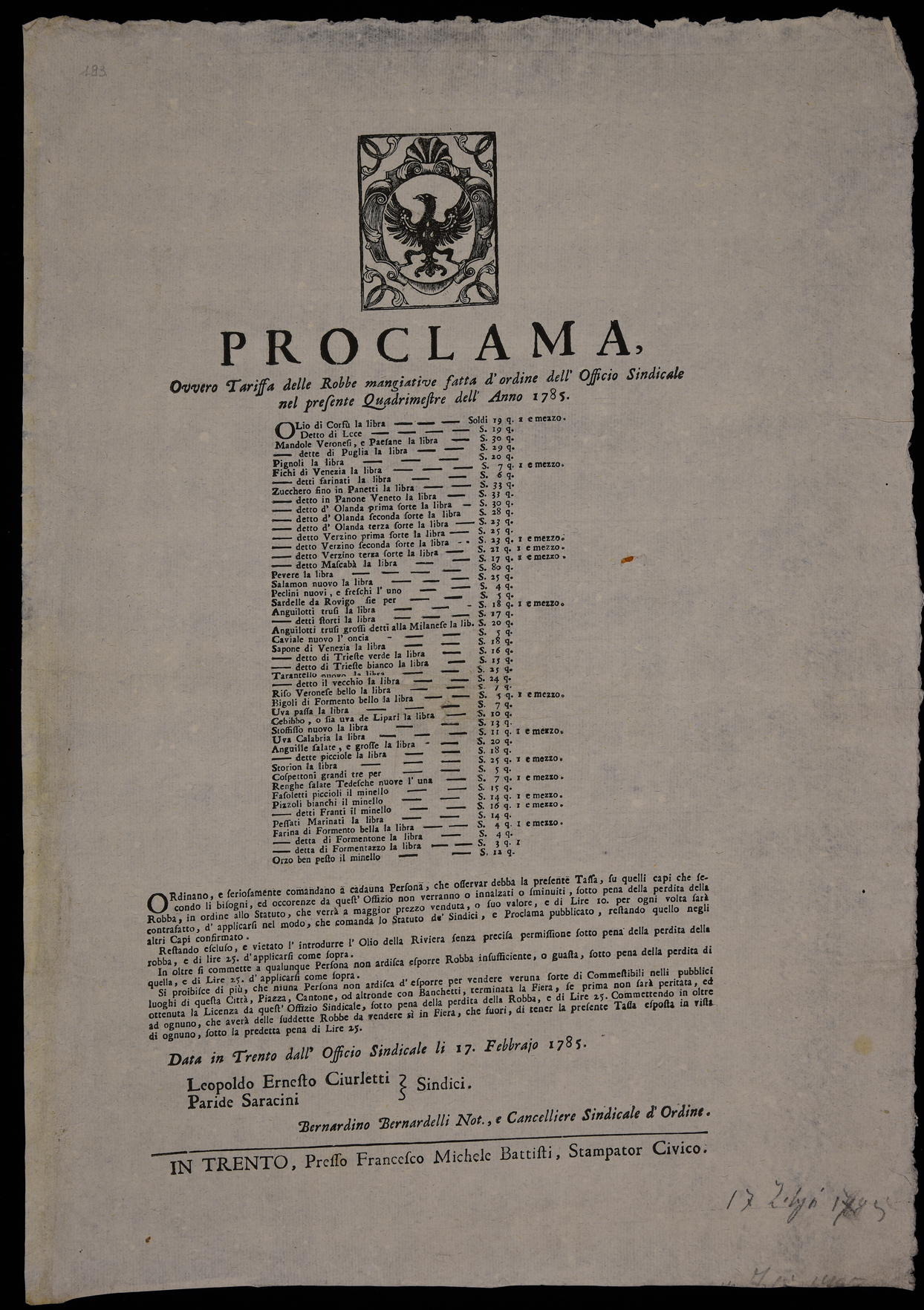 Proclama del Magistrato consolare di Trento sul prezzo dei generi alimentari, emanato il 17 febbraio 1785, sottoscritto da Leopoldo Ernesto Ciurletti, Paride Saracini e Bernardino Bernardelli.